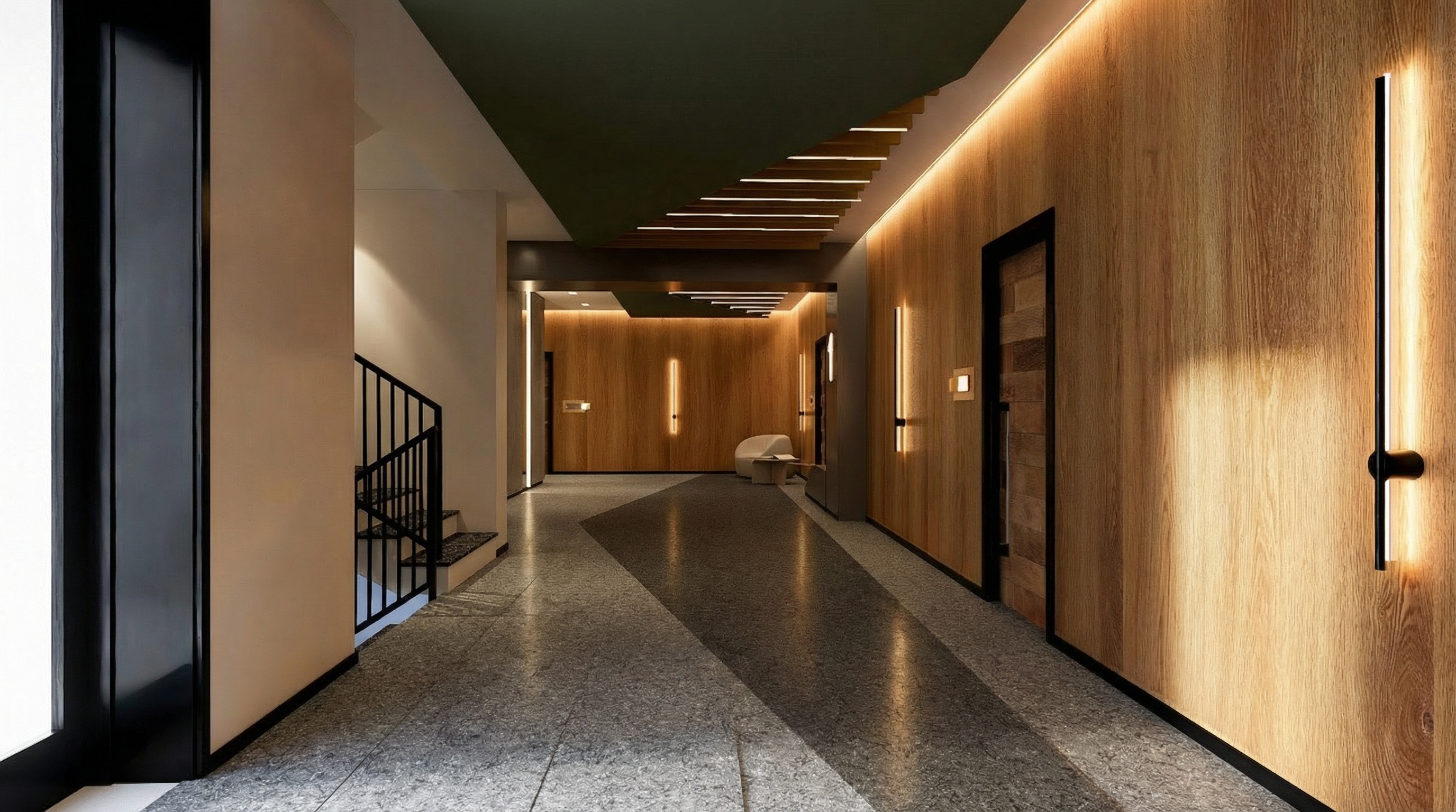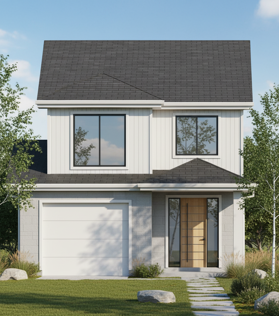 exterior shot render a photorealistic 3d perspective of this house reference the current material with black window frames and wood door stone veneer with white trim and make the landscape nicer vegetation detailed textures in the materials and glass reflections and a vibrant clear sky with light atmospheric depth render in hyper realistic architectural visualization make home setting like a suburban street