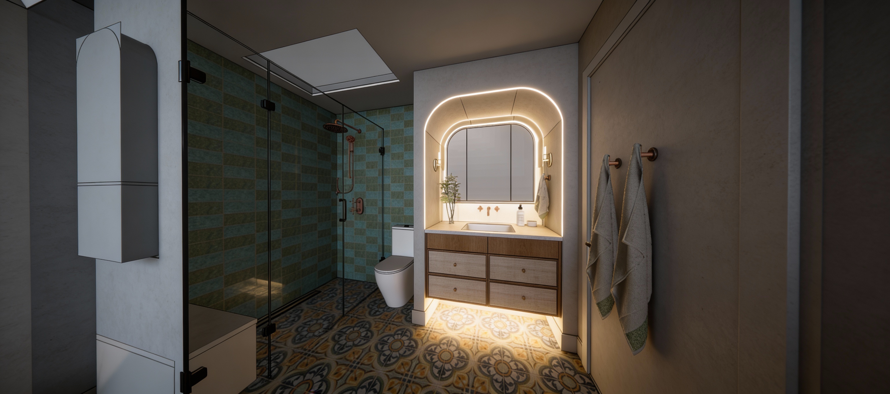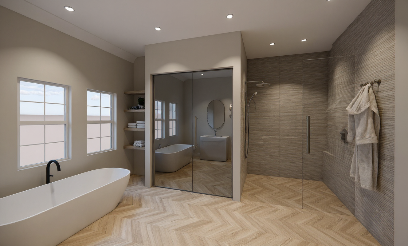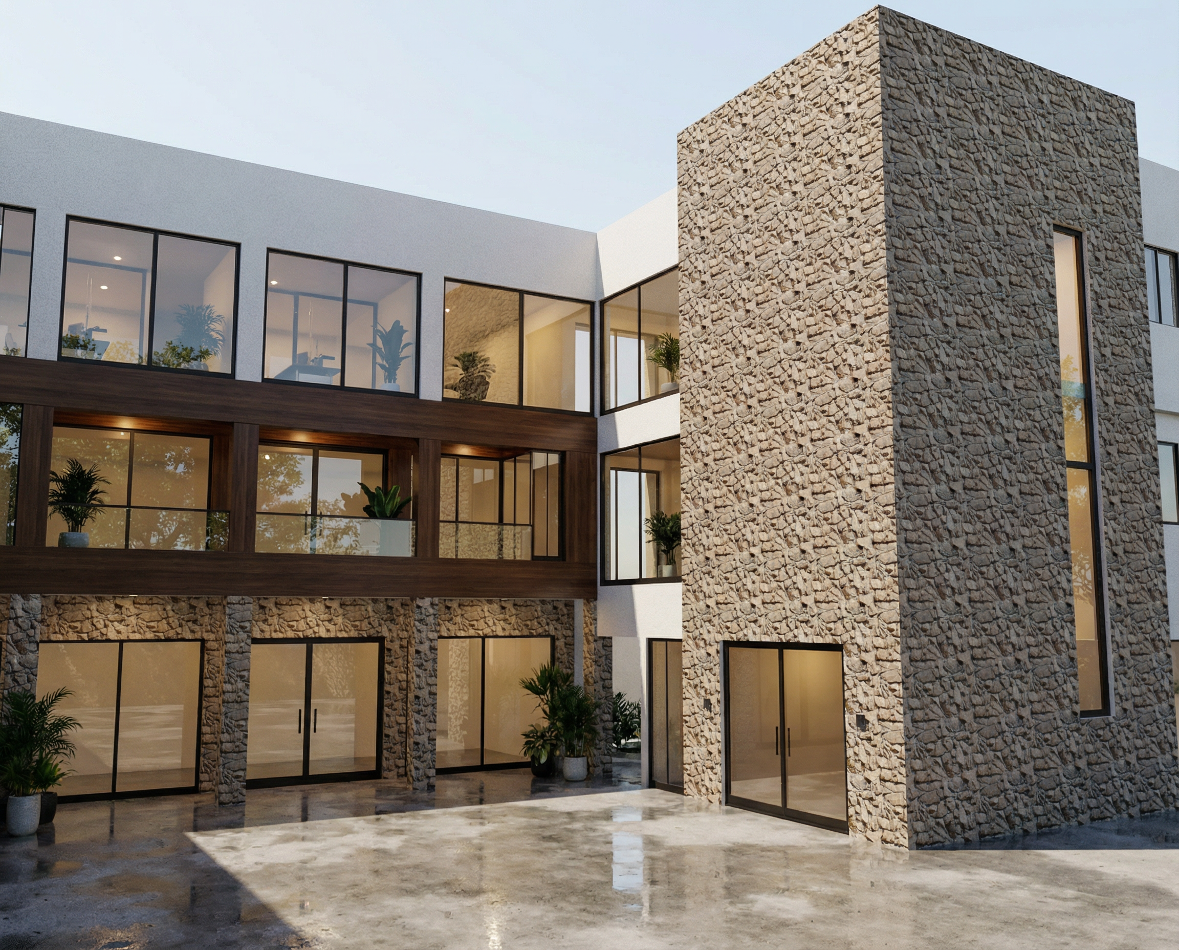 render a photorealistic 3d perspective of this house in a lake arrowhead ca reference the current material style just enhance them certainteed s presidential shake shadow gray roof sherwin williams naval blue batten and board vertical siding complemented by natural cedar timber framing and natural cedar horizontal wood siding accents black window frames and stone detailing further enhance its sophisticated architectural design keep model geometry the same windows doors roof walls garage door pavement driveway do not change the view only enhance the current materials detailed textures in the wood siding and glass reflections and a vibrant clear sky with light atmospheric depth render in hyper realistic architectural visualization quality 8k resolution