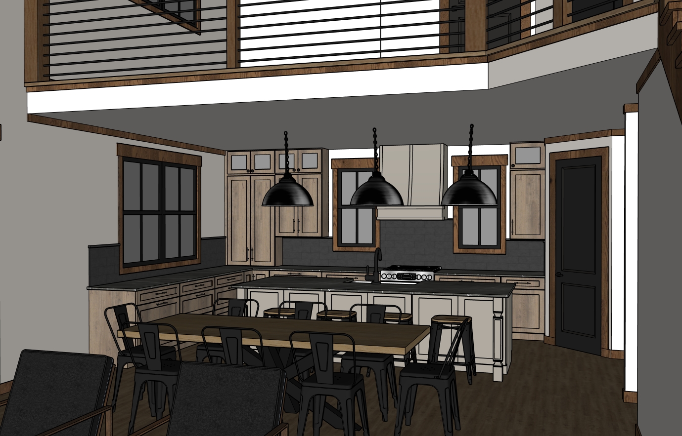 make realistic stage with decor wooded lot outside windows add can lighting modern rustic theme