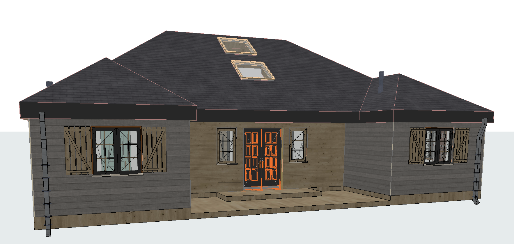shingle roof walls in gray wood to be horizontal wood walls in wood to be clear wood land scape mountains and trees