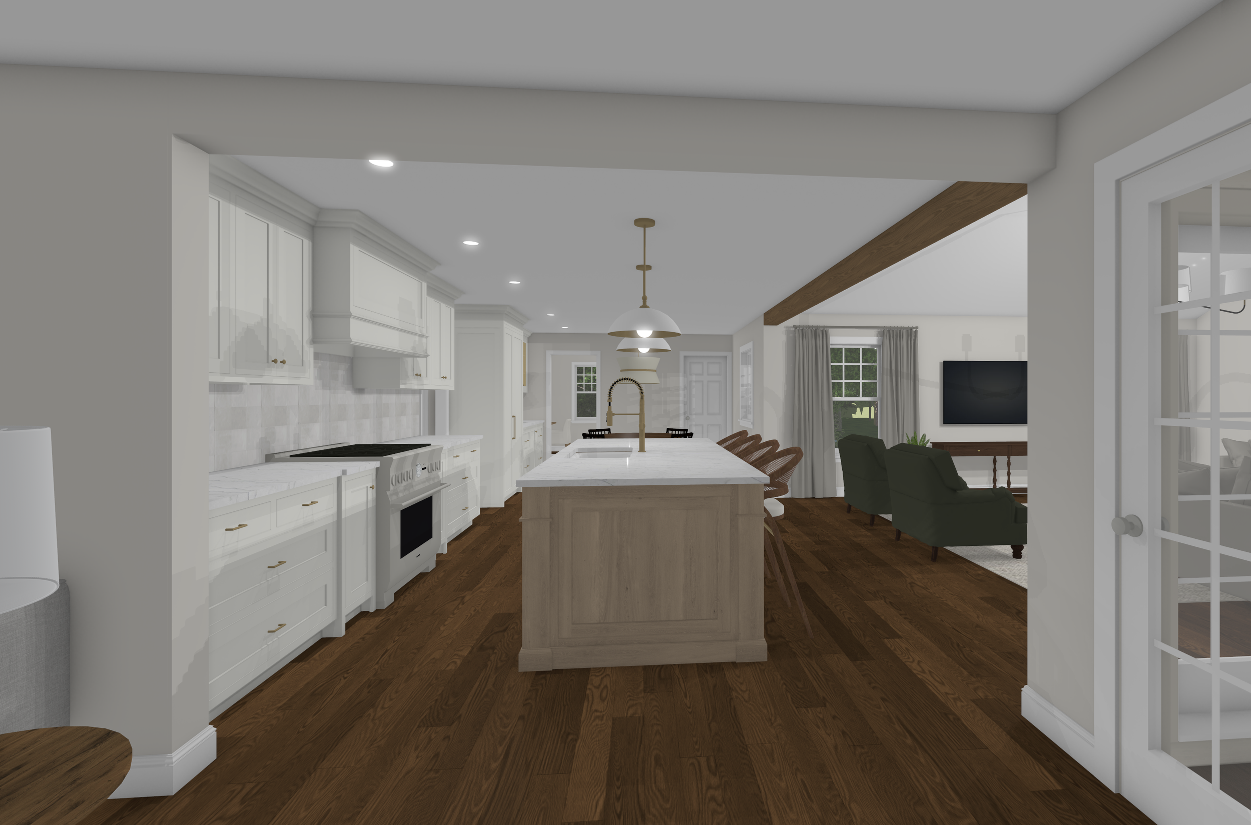 create a photo quality image of this space in the early evening with a woman cooking at the range and two children sitting at the island one on a laptop the other writing in a notebook use a soft neutral color for the cabinetry except for the island cabinet which would be soft cut white oak in a light finish use visual comfort alina pendants over the island and a lulu and georgia natural jute pendant over the kitchen table use dramatic lighting to highlight the refined nature of this kitchen design