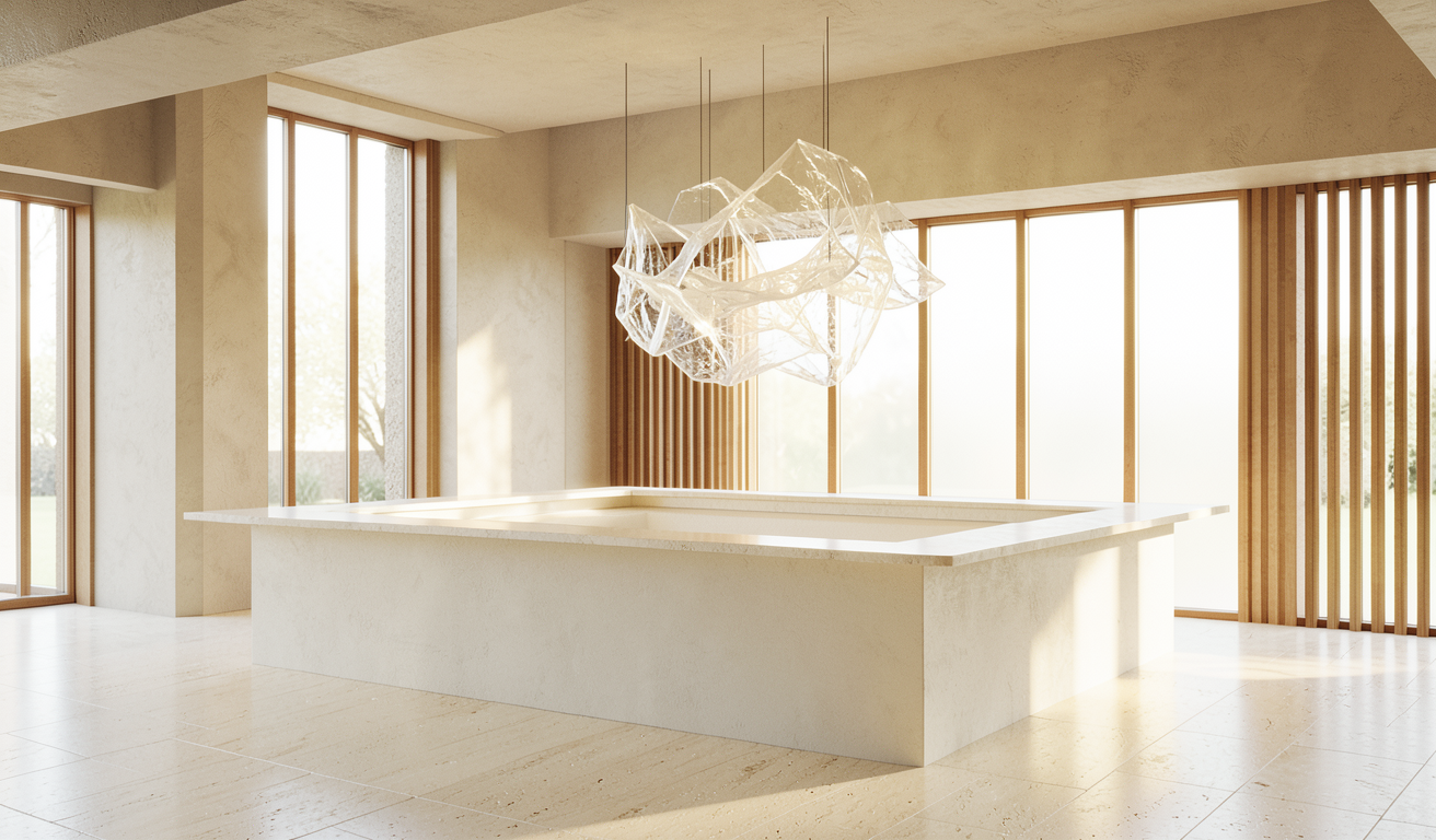 render a spacious modern interior hall with plaster walls and ceilings the floor is a light cream hones limestone enhancing the minimalistic design large windows with warm wooden slats along the walls allow soft natural daylight to flood in creating a warm and inviting atmosphere above the bar is a wide hanging greenery that allows the natural light to pass through