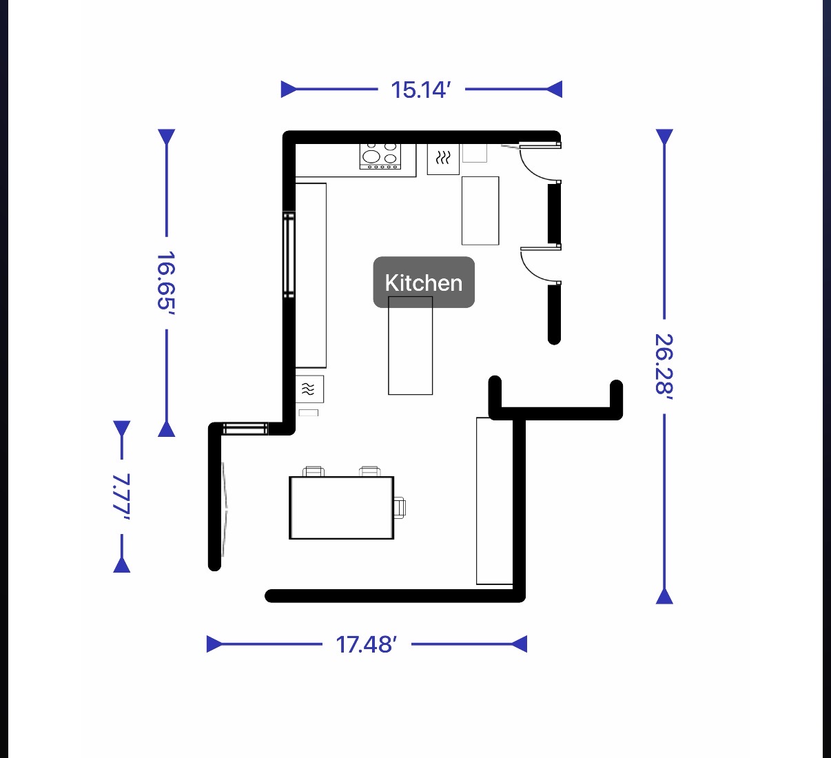 help me make a high resolution kitchen floor plan using these exact room dimensions i want to use a 48 freestanding wolf range i want to use a 48 paneled fridge freezer white oak floor white cabinet