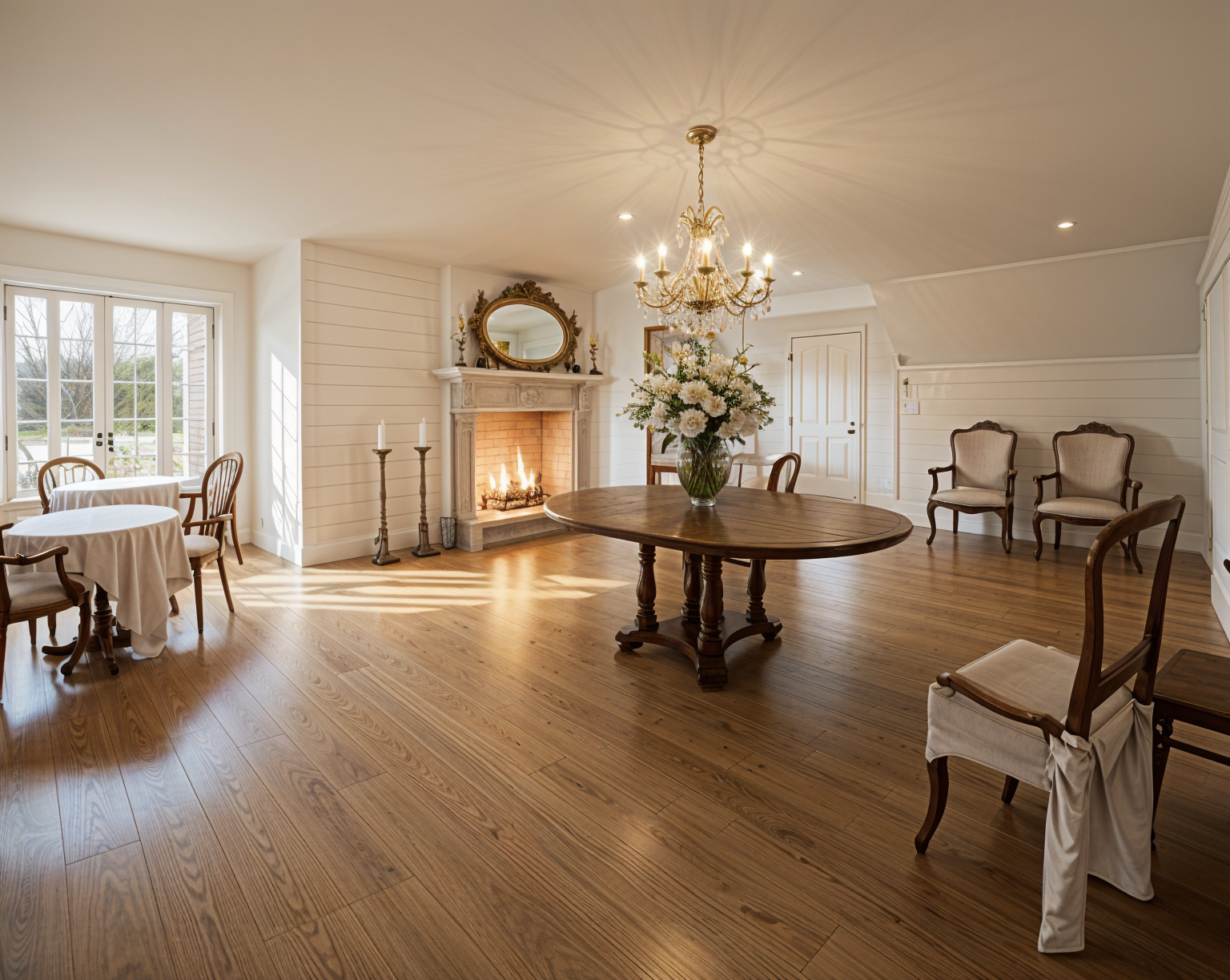 go back to the original image change the view on the other side of the french doors to a wedding reception hall with white tables and wooden chairs