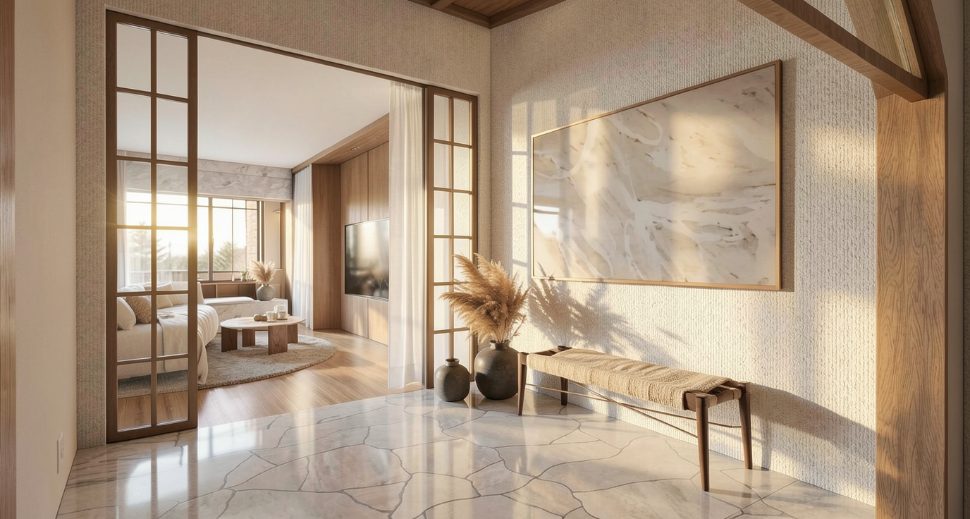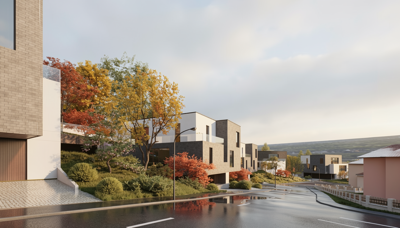 change your roof to flat tiles darken the facades in place of concrete and add more real plants