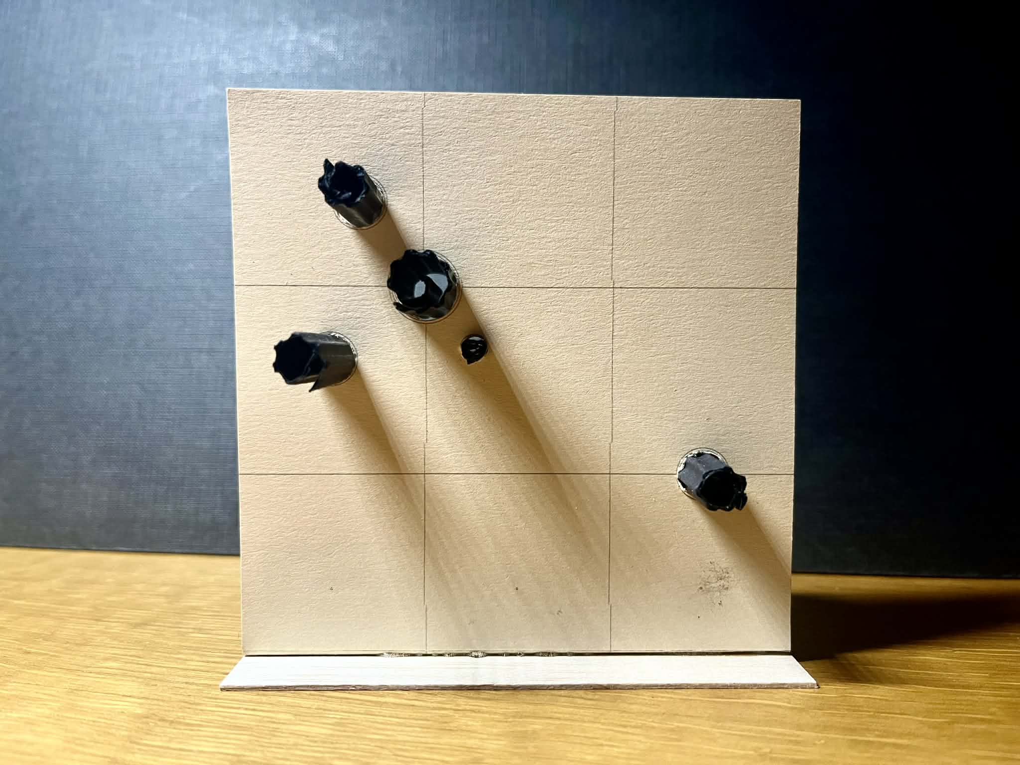 escultura con dos chapas de acero cepillado donde se aprecian las l neas se aladas formando una cuadr cula y otro de las mismas caracter sticas de base donde se colocan cilindros cer micos huecos de mucha rugosidad y color negro mate el suelo es de tarima de roble con barniz mate en el que se colocan sus tablas paralelas a los planos de la escultura la altura de la escultura es de 2 m y hay dos personas que la est n mirando que miden 1 60 m y est n colocadas de tal manera que no tapan los cilindros cer micos las paredes son blancas