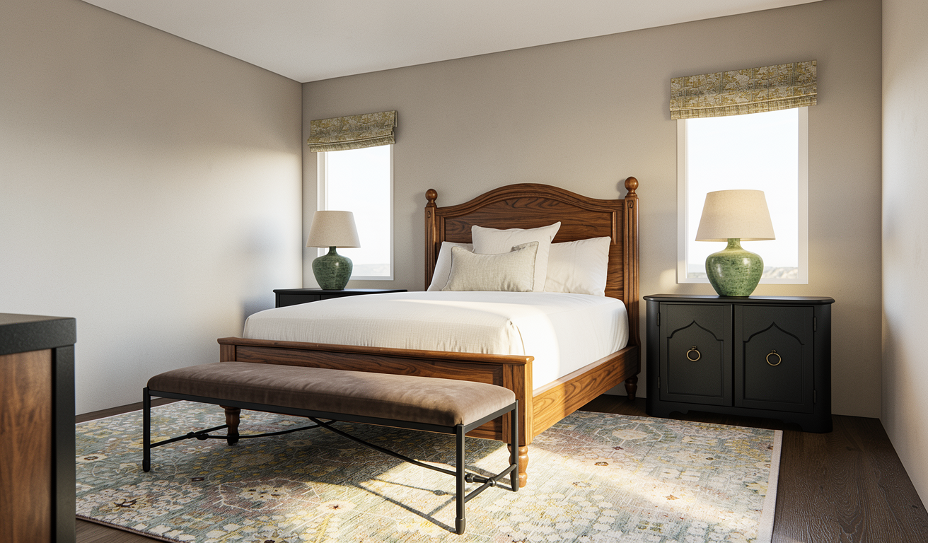 enhanced interior lighting undermount sink set into countertop in the bottom right with a bronze faucet mirror above the sink and faucet white oak cabinetry countertop is white quartz tiled shower shown in the mirror