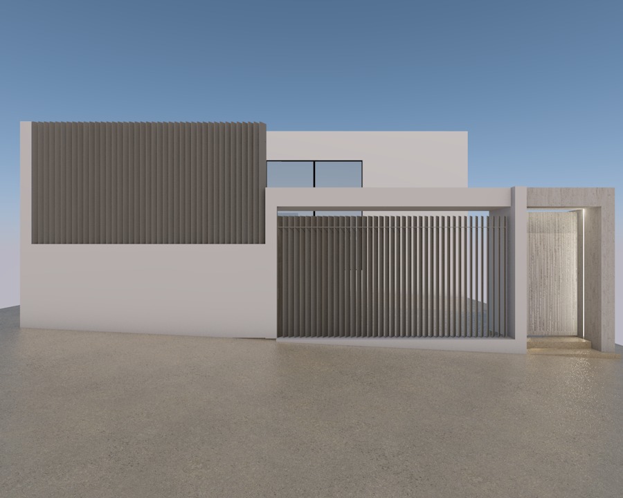 this is the entrance of an apartment building on the right beige metal slats on the left on the right a linear concealed led lighting detail is integrated within this frame enhancing the entrance with a subtle glow the walls are finished in a warm off white tone contributing to the overall soft and neutral palette
