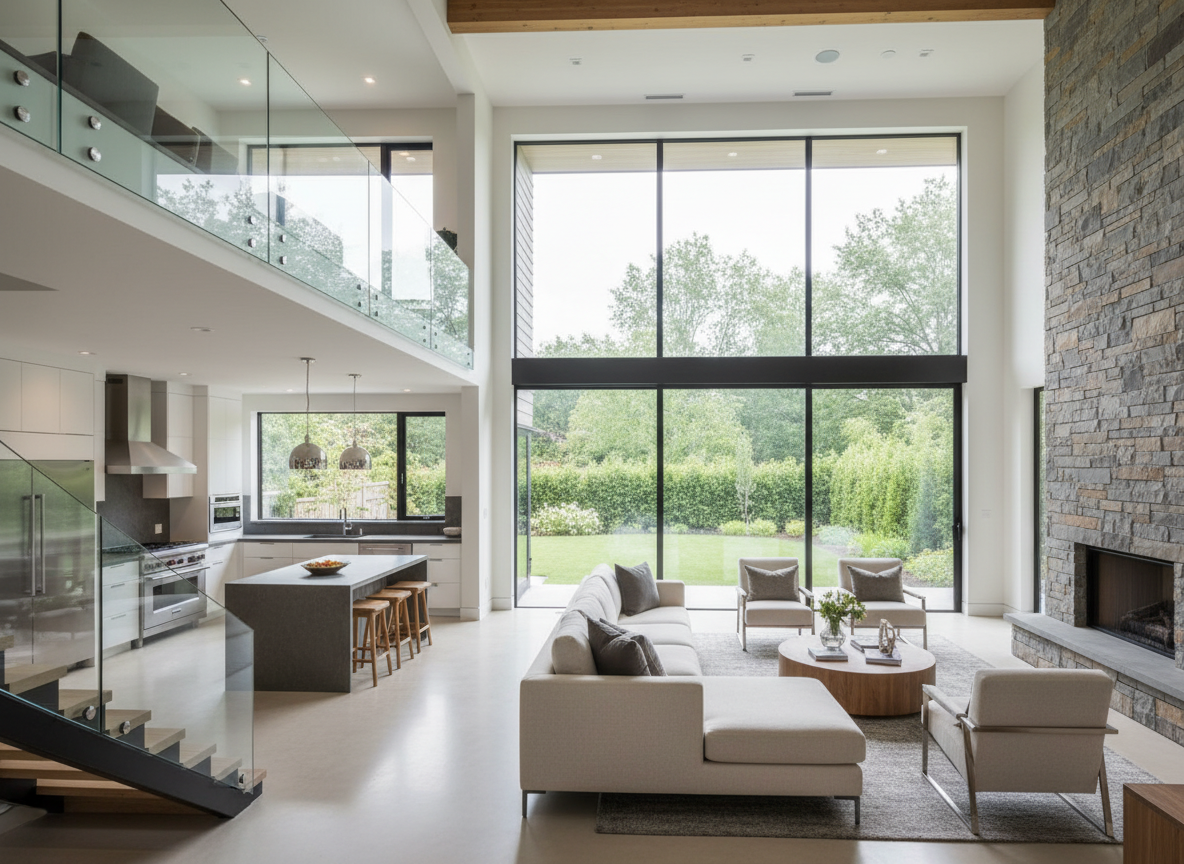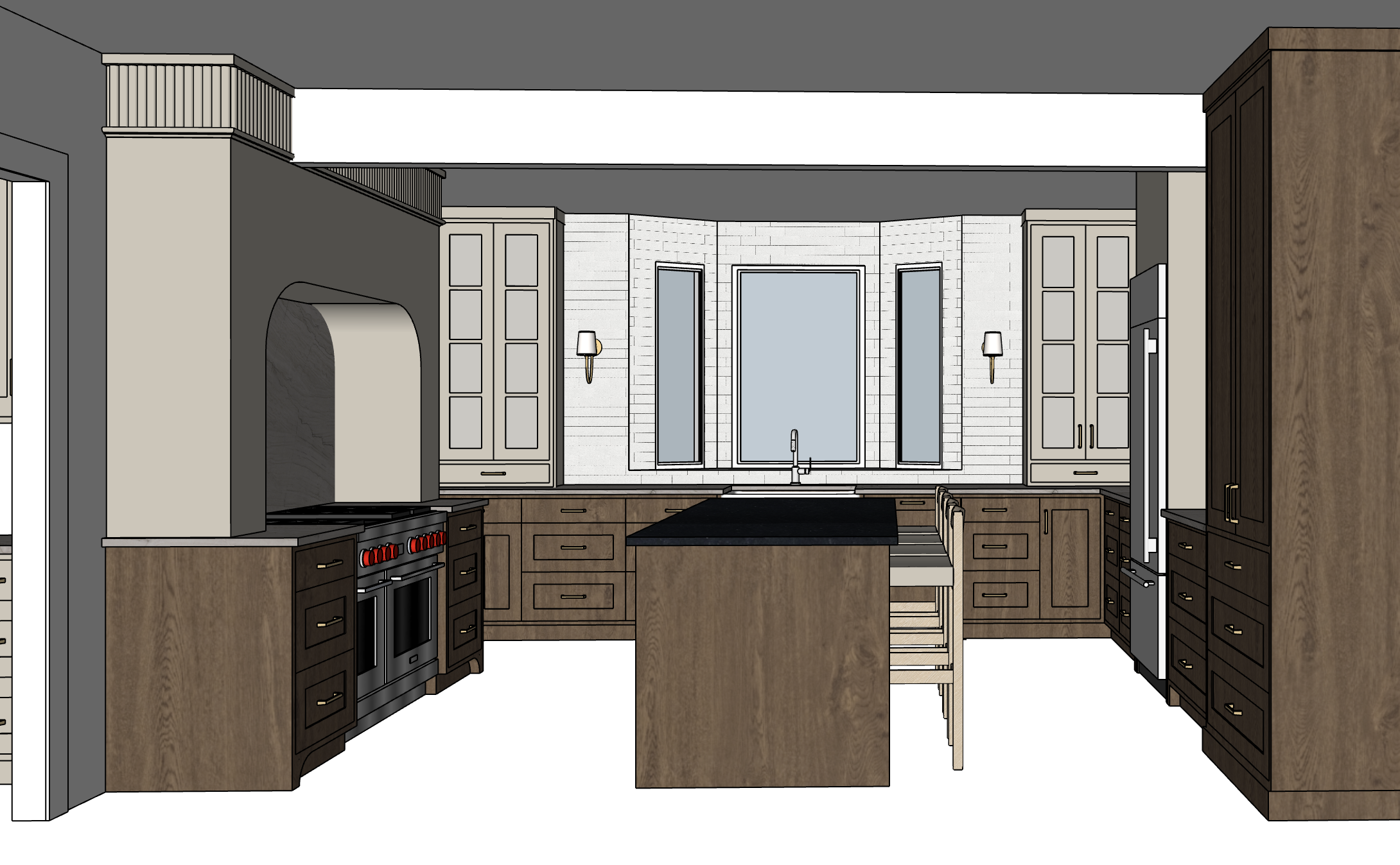 ultra realistic kitchen rendering based on a sketchup model realistic cabinetry materials sw shiitake painted range hood and hutches crystallo quartzite countertops with subtle veining accurate texture scale white oak floors with subtle wear and color variation matte painted walls with slight texture realistic fabric upholstery with visible weave physically accurate reflections and shadows soft indirect light global illumination professional interior photography crisp edges high detail clean modern aesthetic full frame camera 28mm lens