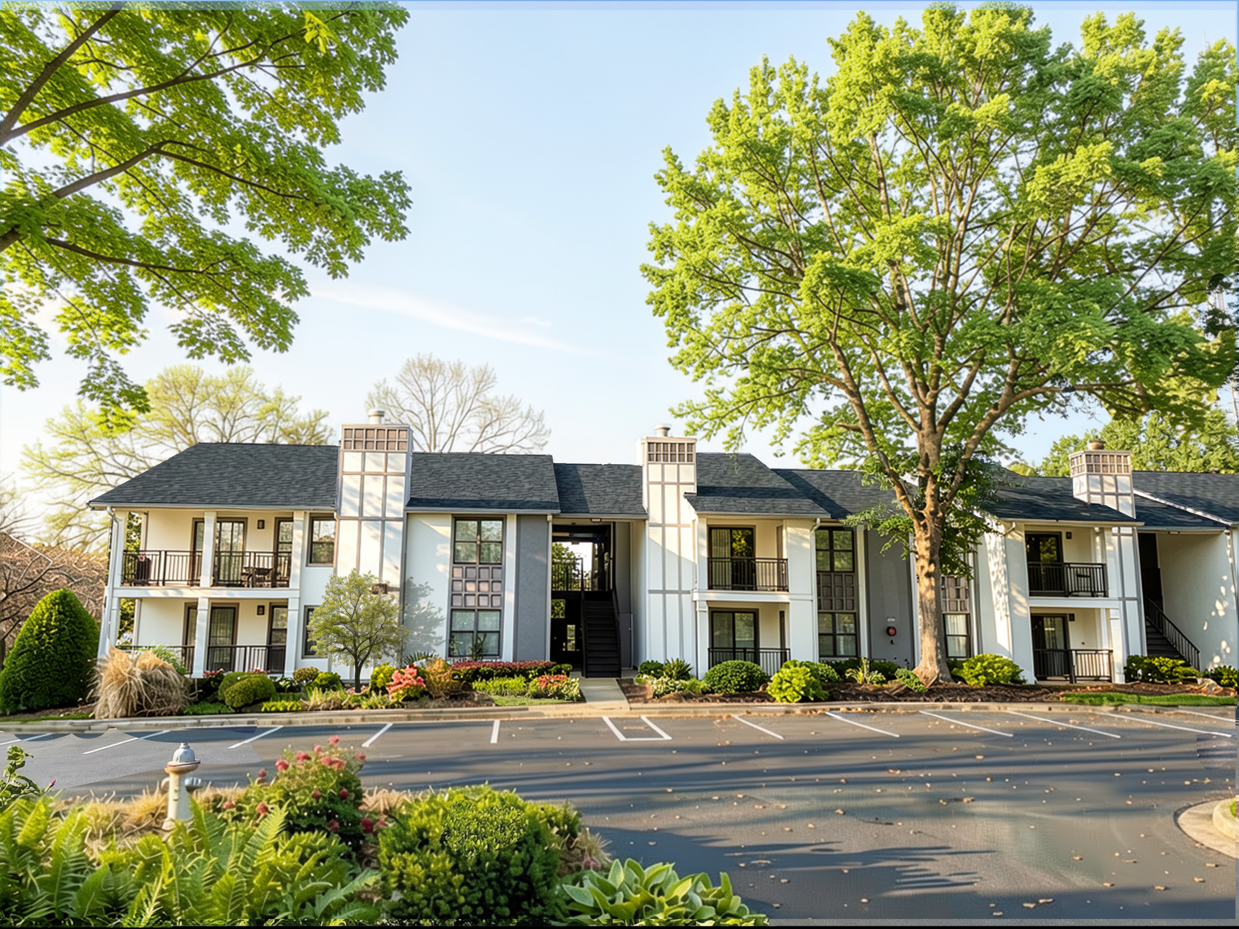 do not change the camera view or angle do not change the aspect ratio remove the building keep all landscaping trees and parking lot the same