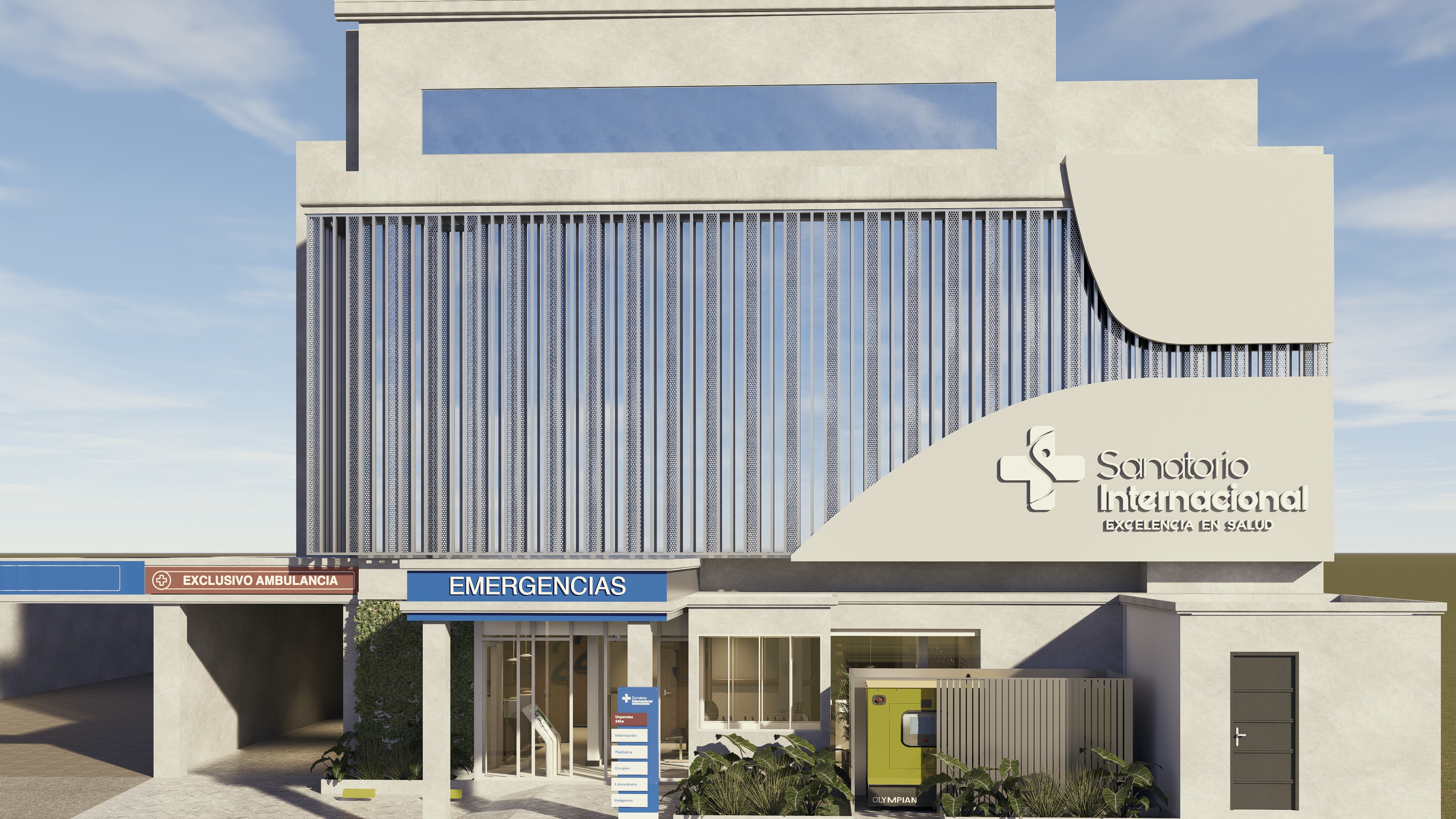 photorealistic hospital facade realistic concrete texture natural daylight soft shadow gradients true material roughness subtle surface imperfections realistic glass reflections urban context lighting preserve all existing signage and text exactly as is do not modify typography keep all letters identical and readable no cgi look