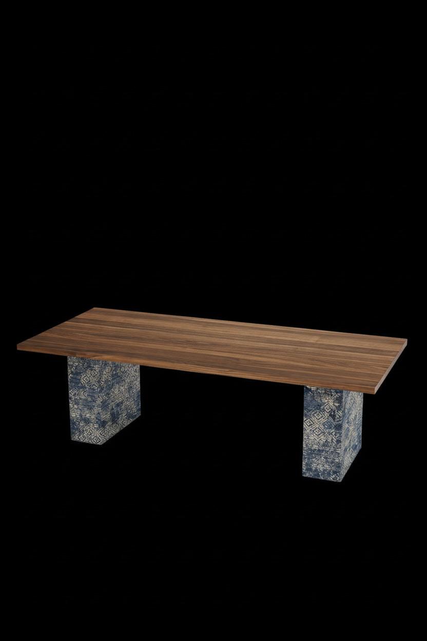 keep the table exactly as in the input image do not change the table texture wood shape or proportions create a mediterranean inspired interior background soft white walls coastal luxury style natural sunlight subtle shadows light matte floor hints of washed stone textures no clutter minimal but warm coastal feeling colors navy white sand beige add a sense of sea breeze light but no ocean view and no direct seaside elements everything elegant neutral and premium no chairs