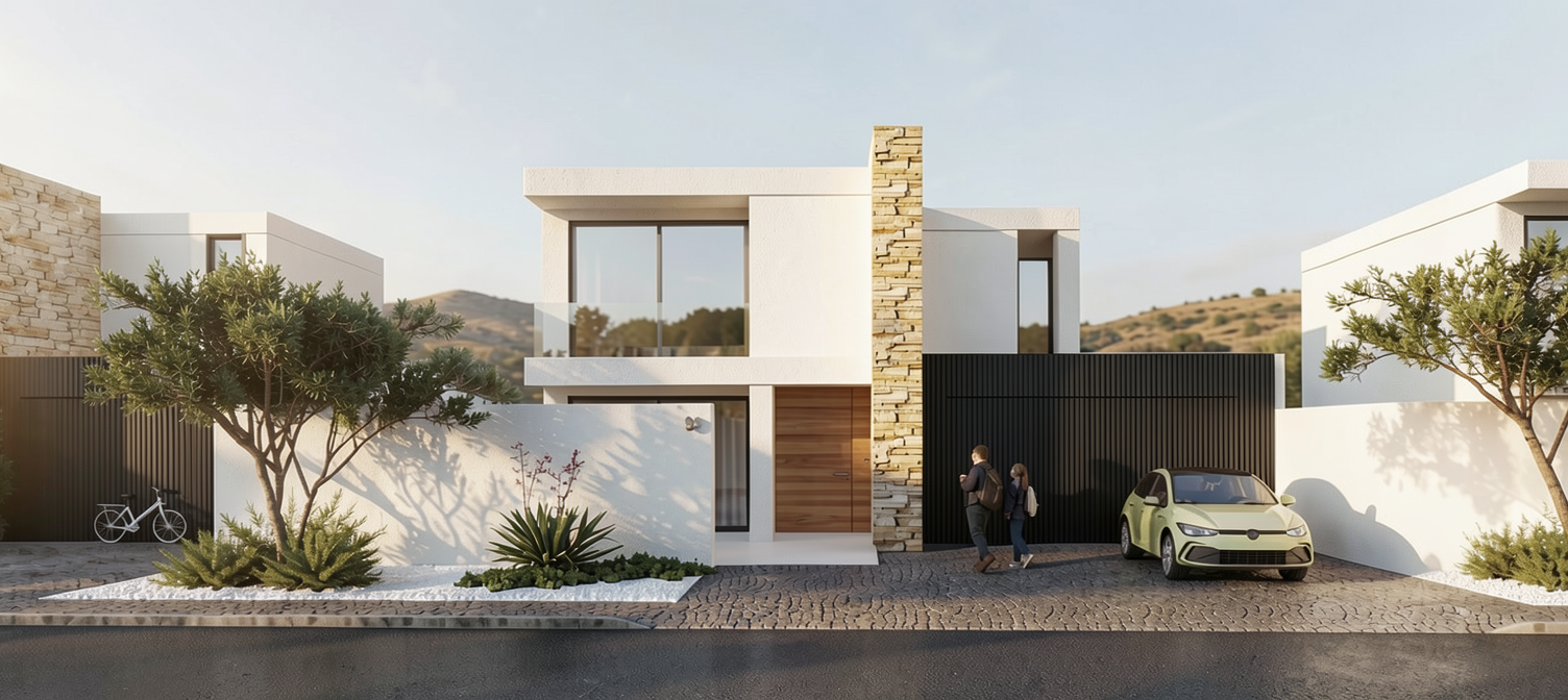image type hyper realistic architectural render high end editorial photography style scene framing maintain overall composition and camera position from the reference image frontal view eye level approx 1 60 m neutral lens 35mm no distortion main elements modern mediterranean house with white stucco vertical stone wall wooden recessed door black slatted gate glass railing car on the right two people walking bicycle on the left keep layout but allow refinement of environment and background for realism materials remove cgi look all materials must feel real imperfect and physically believable no flat shading no uniform textures introduce subtle variation micro roughness and light irregularity wood natural grain variation slightly uneven tone stone deeper relief and shadow between layers stucco subtle tonal variation not perfectly flat asphalt pavement slight irregularity no procedural repetition lighting critical add specular life mediterranean sunlight from the left introduce controlled specular highlights on key materials glass stone edges car pavement add small light glints and reflections especially on glass railing car body stone edges light must feel crisp and alive not flat no haze no washed out lighting reflections force correction glass reflections must be sharp high resolution and physically accurate reflected vegetation and surroundings must be clearly readable increase reflection clarity and contrast slightly vegetation remove blur add depth vegetation must be sharp dense and volumetric leaves clearly defined no softness or blur internal shadowing inside the canopy no cut out effect no transparency background force replacement if needed replace or regenerate the background if necessary background hills must be sharp detailed and naturally integrated add subtle terrain texture and scattered vegetation no blur no low resolution look no flat gradient hills image sharpness global entire image must be in focus no depth of field blur crisp edges high micro contrast color atmosphere natural slightly desaturated balanced contrast no grey haze no dullness style high end editorial architectural photography sharp precise realistic no cgi softness quality ultra realistic high resolution physically accurate materials pbr high micro detail no noise no blur no artifacts restrictions do not keep blurry background do not produce soft or washed lighting do not generate plastic materials do not smooth textures avoid any cinematic or dreamy effects