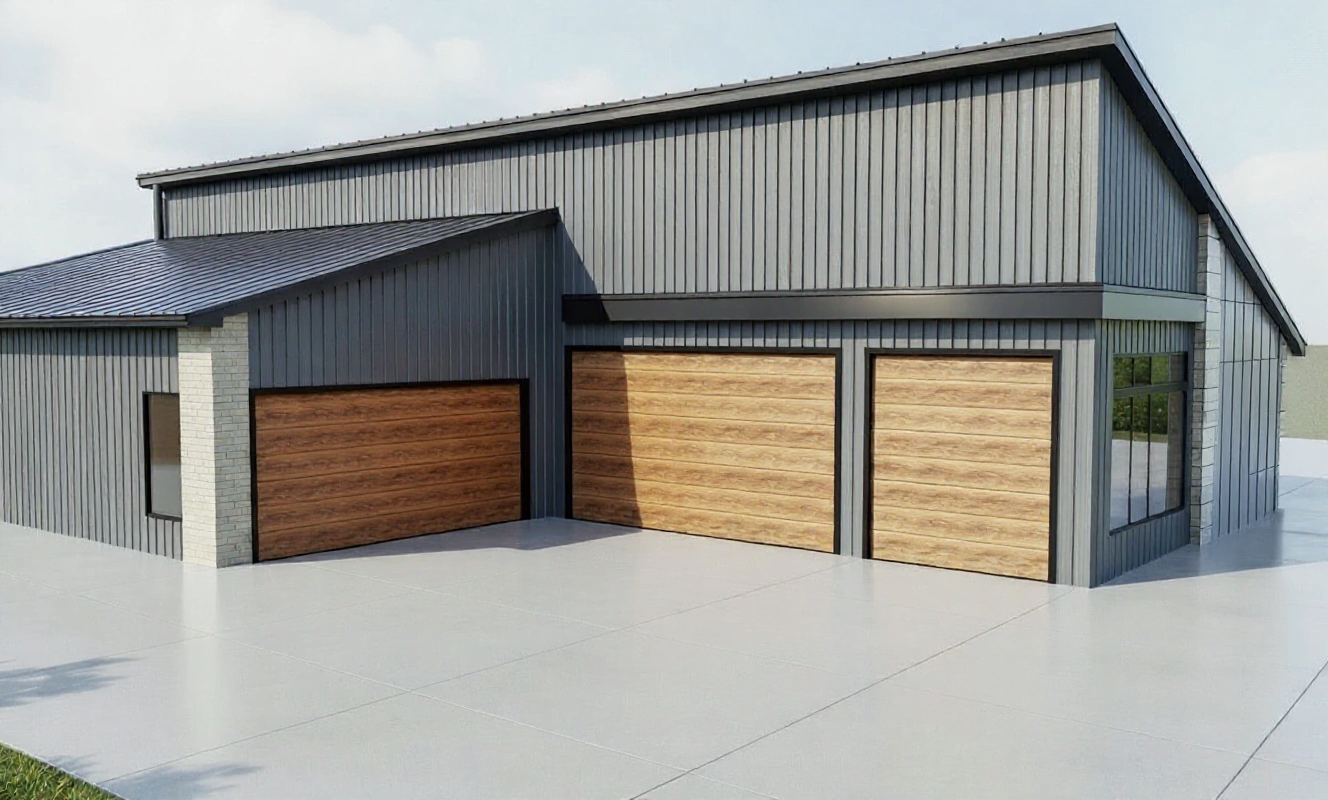 create an extremely realistic rendering with graphite siding horizontal wood plank garage doors and black trim metal accent siding tiles on the right siding of garage