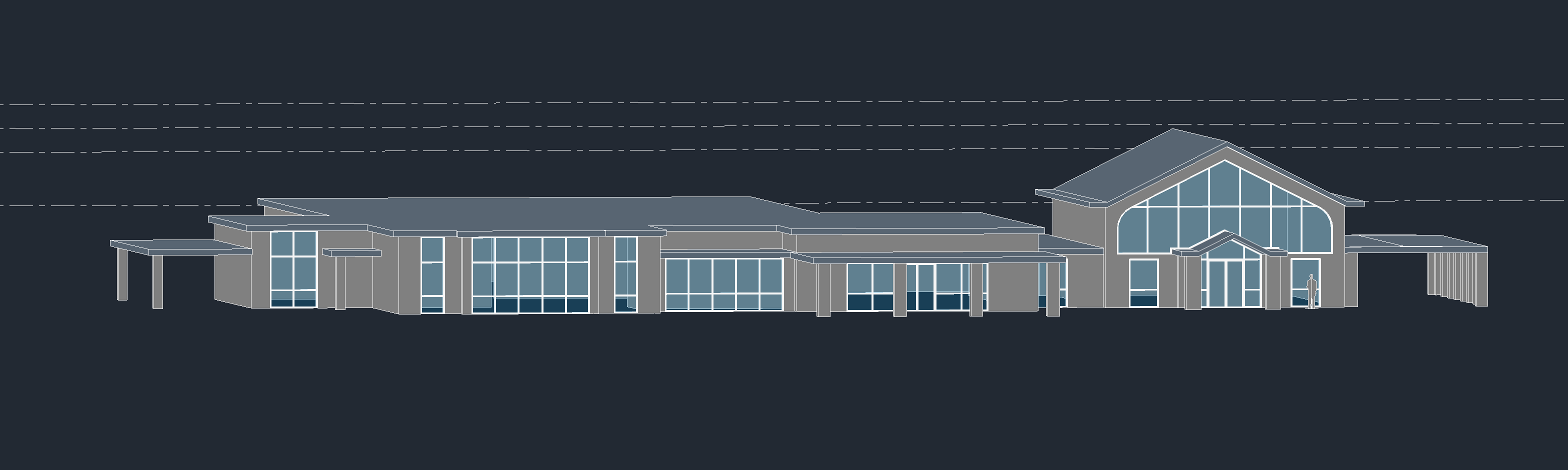 this is a funeral home in kansas mid century modern architecture with strong influences of googie futurist design and some ecclesiastical modern traits add a driveway under front porch make clean cut landscaping common to kansas wall material should be limestone concrete