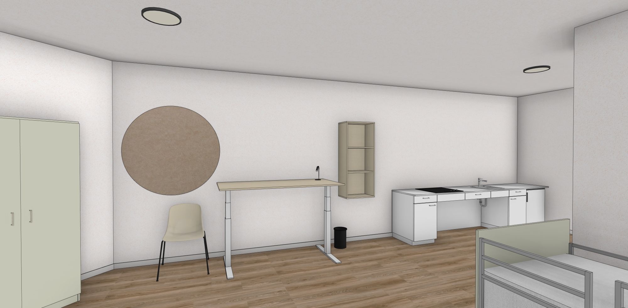 maintain all colors natural daylight turn lights on table top and small wall cabinet are textile beige from egger big cabinet and bed ends are sage green from egger make as photorealistic as possible