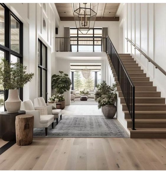 interior shot solid timber ttreads and rusers to matcvh herringbone timber floor in a mid brown ccolour wall panelling to white painted walls metal ballustrade in black brass reveal to teh 2 doors