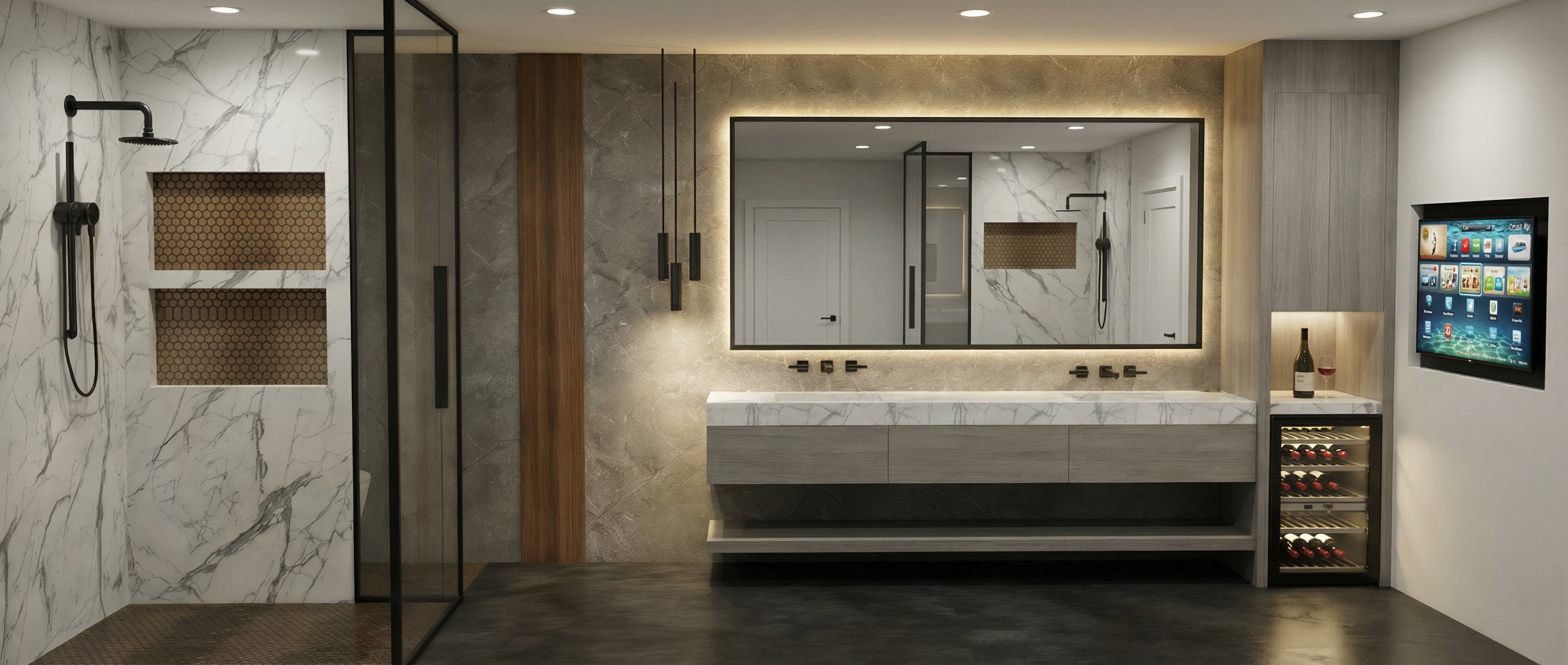 a luxury hotel room bathroom high end materials the cabinet with the wine is a light grey wood veneer the wall the tv is a crisp white paint the mirror reflects the white wall that is in front of it with a door the sink vanity is a gorgeous wood stain that matches the wood strip on the wall