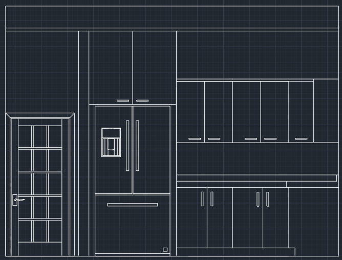 render the inside of this kitchen elevation using a clean modern natural color pallete like dark wood for the cabinets and white tile blackslash
