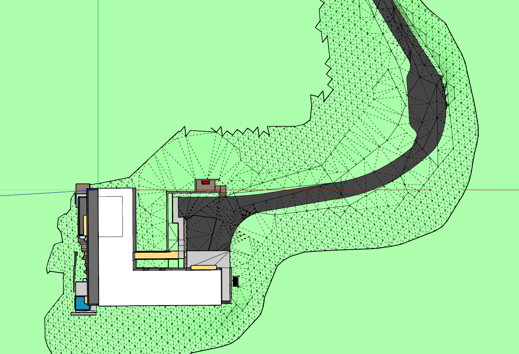 please turn this screenshot of my model into a colorful landscape plan view render the house is in an aspen forest and we ve proposed new trees around the driveway placed in naturalistic clusters not lines the building can be a dark grey landscape elements should be softer grey or earth tones