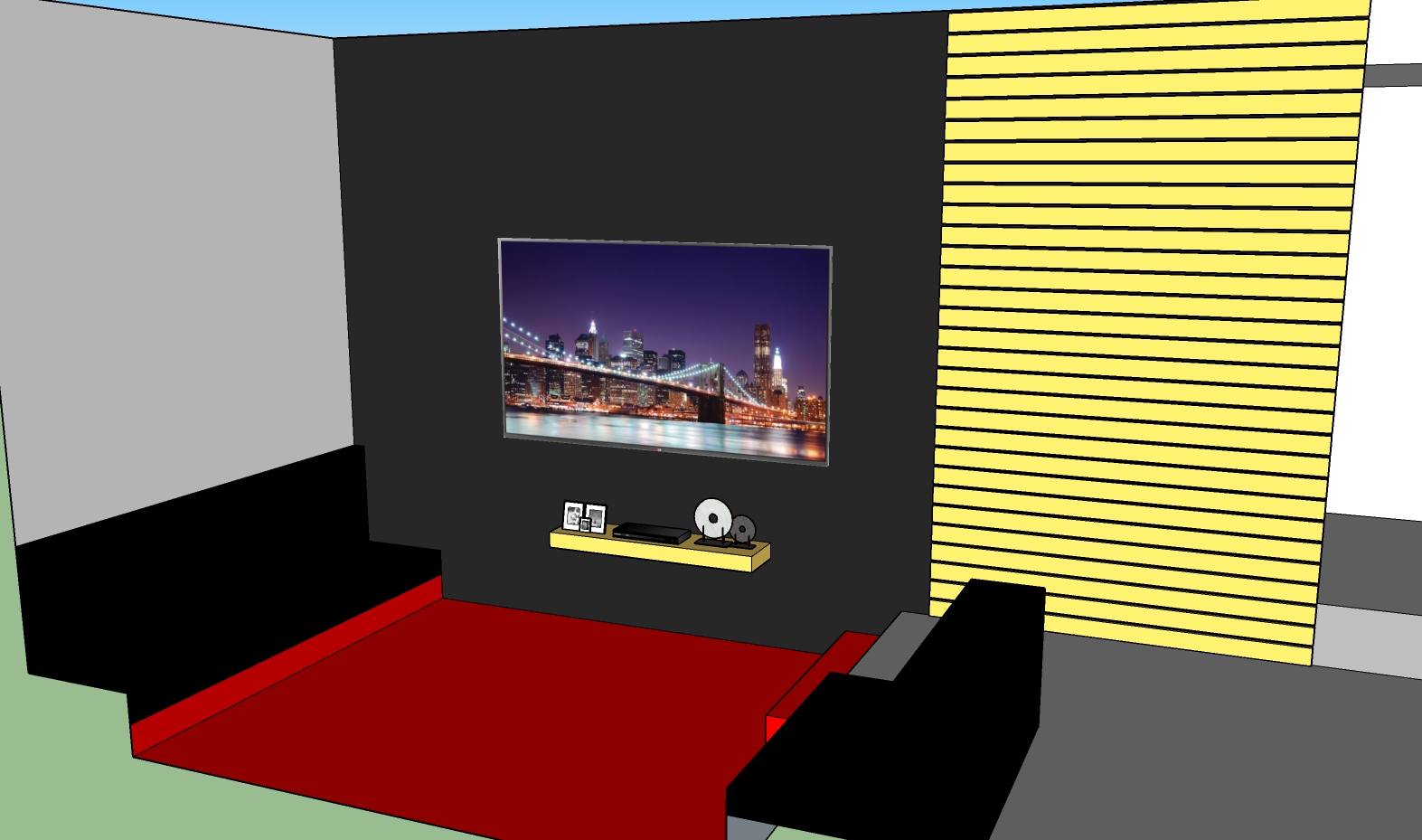 interior rendering of a movie room with a large television with red shag carpet on the floor and black bench seating with the tv wall being almost black with wood trim on the walls the seating shall have lighting at the base