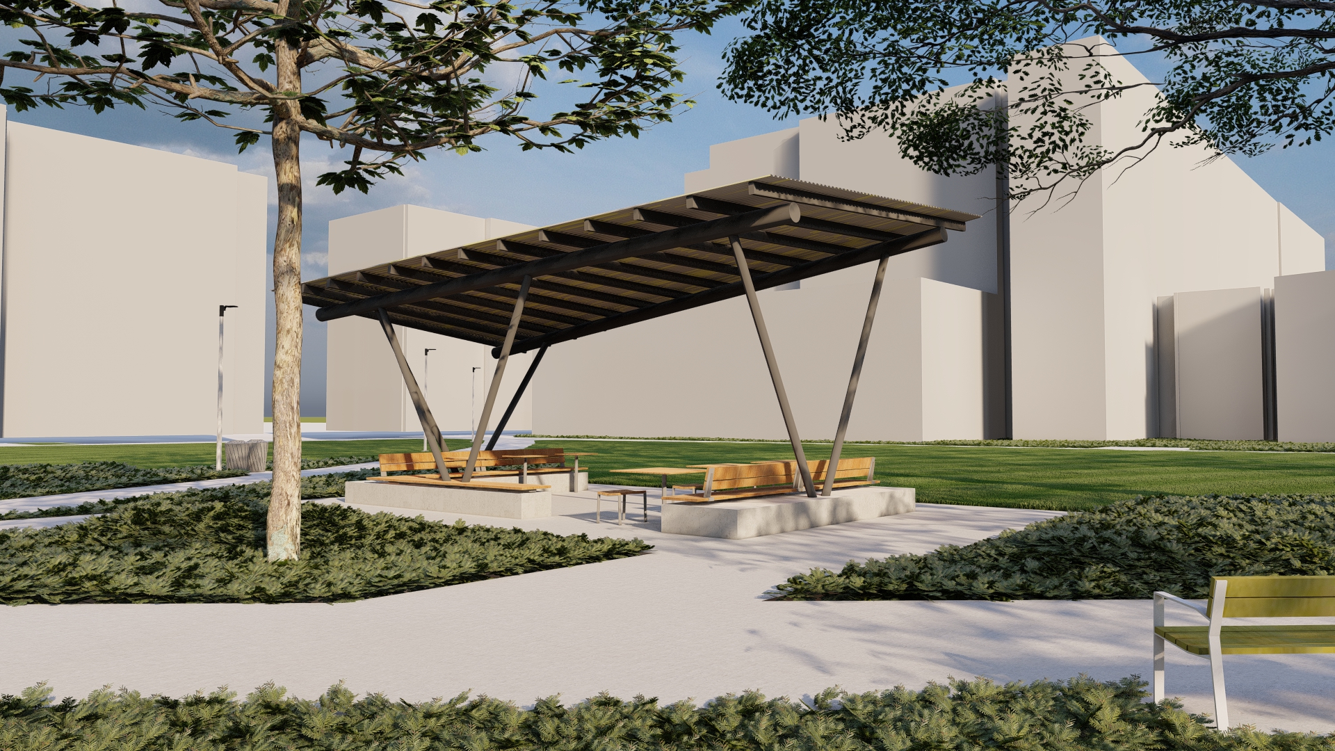 leave background as is show students studying underneath pavilion show plant beds as native iowa short grass prairie