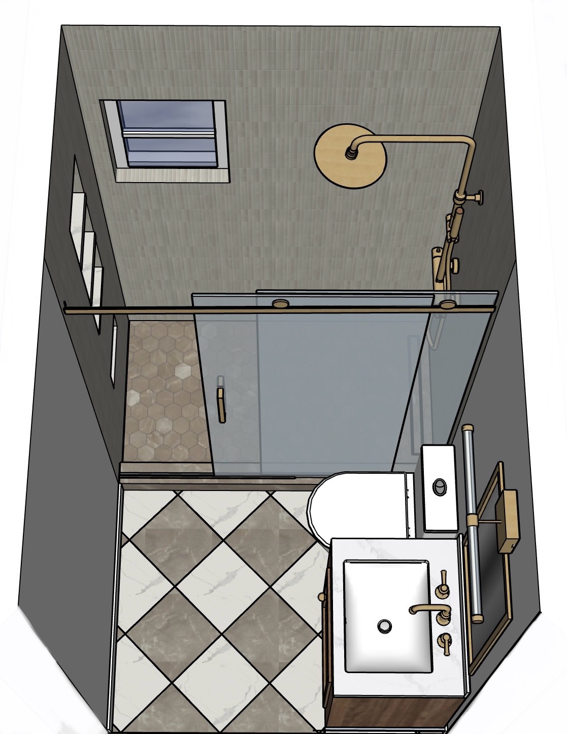 a cozy and modern bathroom with a minimalist design the walls are white creating a calm and relaxed atmosphere the shower walls features glossy vertical fluted porcelain tile warm bone ivory color subtle tonal variation reeded texture minimal modern aesthetic soft light reflection seamless grout clean architectural finish on the floor it features honeycomb patterned tiles in taupe complementing the matte brass shower head and fixtures the glass shower door is crystal clear adding elegance to the space the floor is adorned with diamond patterned tiles in alternating white and taupe adding a touch of sophistication the vanity is a sleek white with a wooden base matched with brass faucet fixtures the mirror above the vanity is framed with the same brass golden touch soft natural lighting comes from a frosted window casting a soothing glow throughout the room