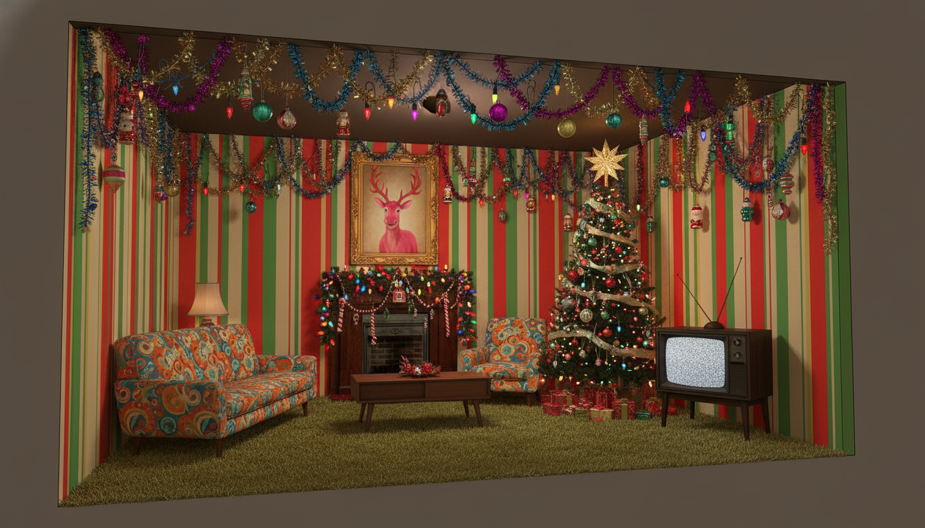 change the brown wall around the outside of the alcove into a cream color te space is inside a christmas market so please add out of focus shoppers and customers walking past in the foreground with shopping bags dressed in winter clothes