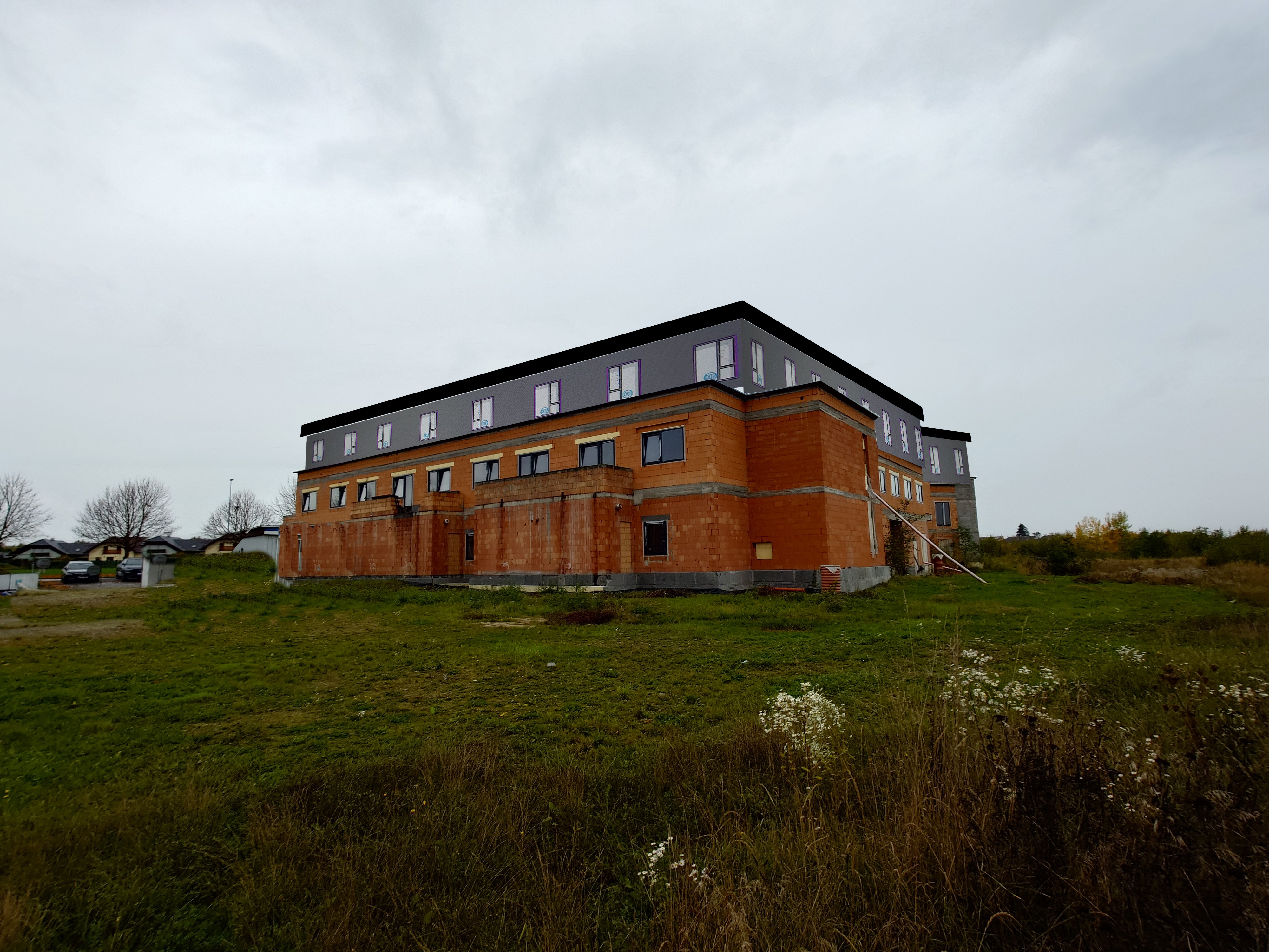 modernist exterior shot put brick facade on first two floors third floor black metal panels roof black put alzheimer home garden in front architecture