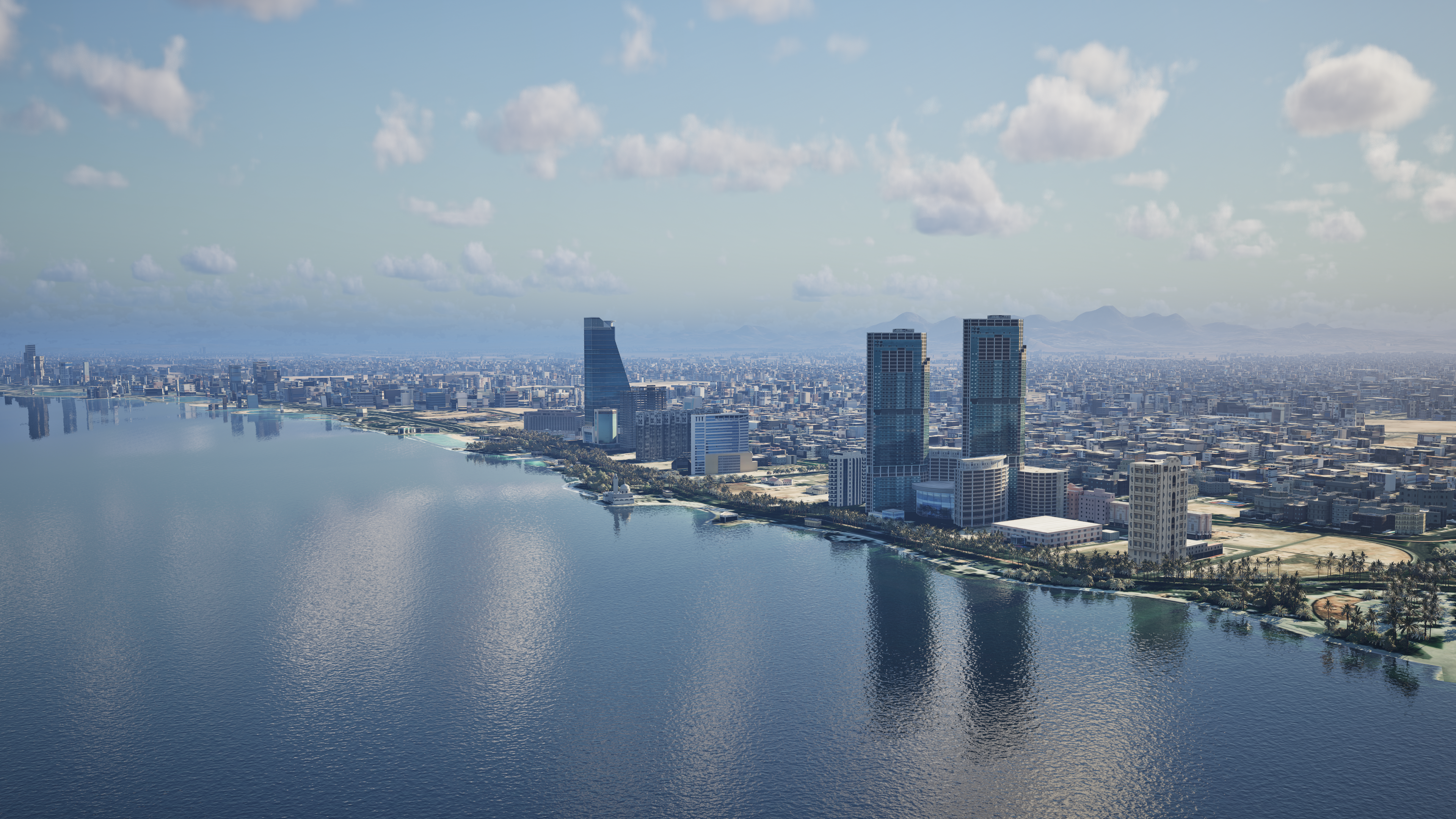 aerial view of a modern coastal city featuring a slightly hazy clear blue sky the ocean reflects the sky s hues adding shimmering shades of light blue and turquoise sleek skyscrapers predominantly in glass and steel rise from the shoreline casting detailed reflections on the water the cityscape extends to the horizon with varying shades of grey and slate for the buildings verdant greenery highlighted with deep greens lines the coast providing a refreshing contrast the atmosphere is calm and serene with a gentle breeze suggested by the subtle movement of the clouds and water maintain building design exactly photorealistic drone footage style