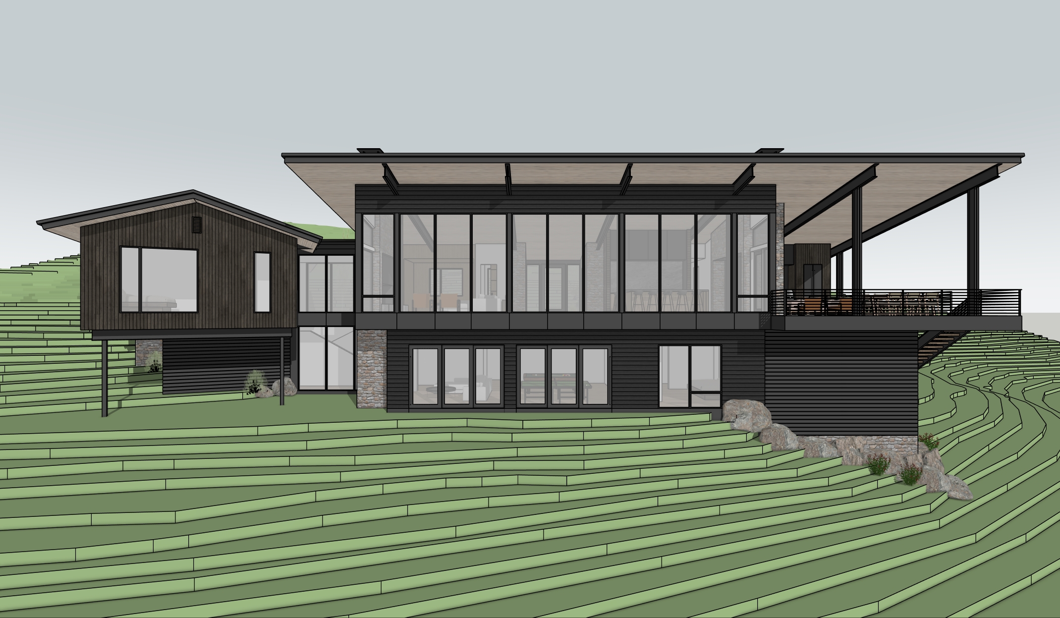 do not change geometry or materials on house home located in the blue ridge mountains near asheville north carolina plate steel chimney coping to match window frame color home located in north carolina hardwood forest with dense trees beside home and behind add flagstone paver patio outside of lower floor doors with chairs and fire pit grasses and sparse native plants in foreground no lawn soft early morning light with light fog in trees behind remove terracing from landscape