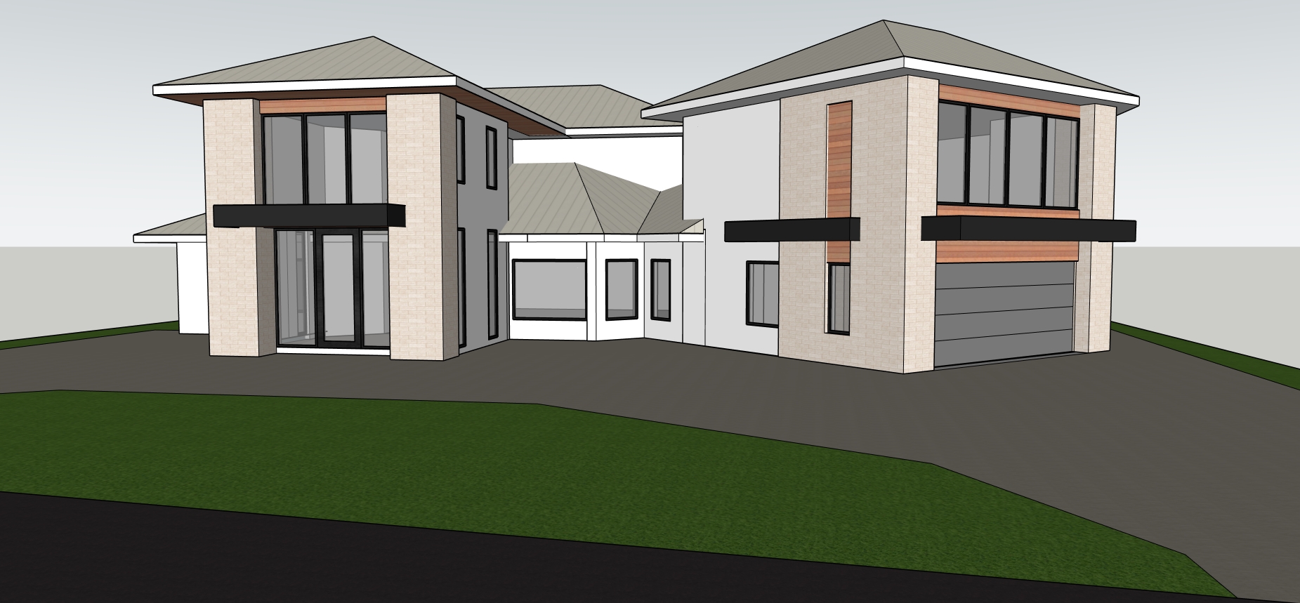 render a modern two story house with a sleek contemporary design the walls are off white with light beige stone accents the window frames and horizontal bands are a deep charcoal black the roof is a smooth light grey metal the wooden paneling under the roof line and above windows is a warm rich cedar brown the driveway is brick complementing the lush vibrant green lawn florida landscape set the scene in a serene early morning atmosphere with a soft overcast sky that casts gentle diffused lighting over the house