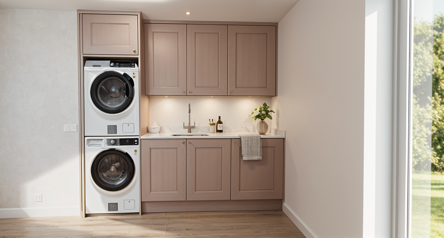 generate a photorealistic version of this wet bar design the base cabinets should be quarter sawn stained white oak the upper glass cabinets should be quarter sawn stained white oak the inner 2 upper cabinets should be a creamy off white the floating shelves are stained white oak 2 puck lights at the top over the floating shelves under cabinet and shelve lighting taj mahal quartzite countertops and bronze fixtures antique bronze wall sconses and a alabaster wall trim color white oak wood floors the mini fridge should be paneled to match but has a glass door to see the drinks