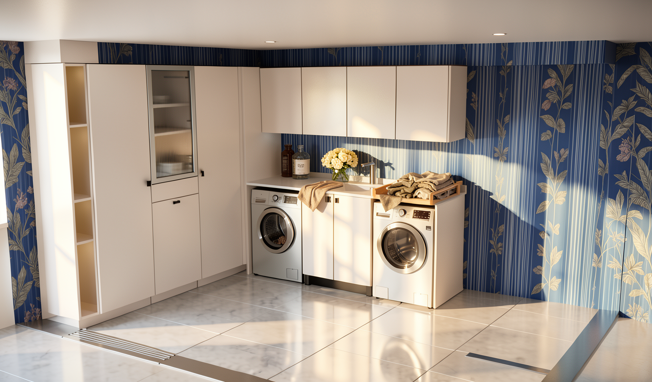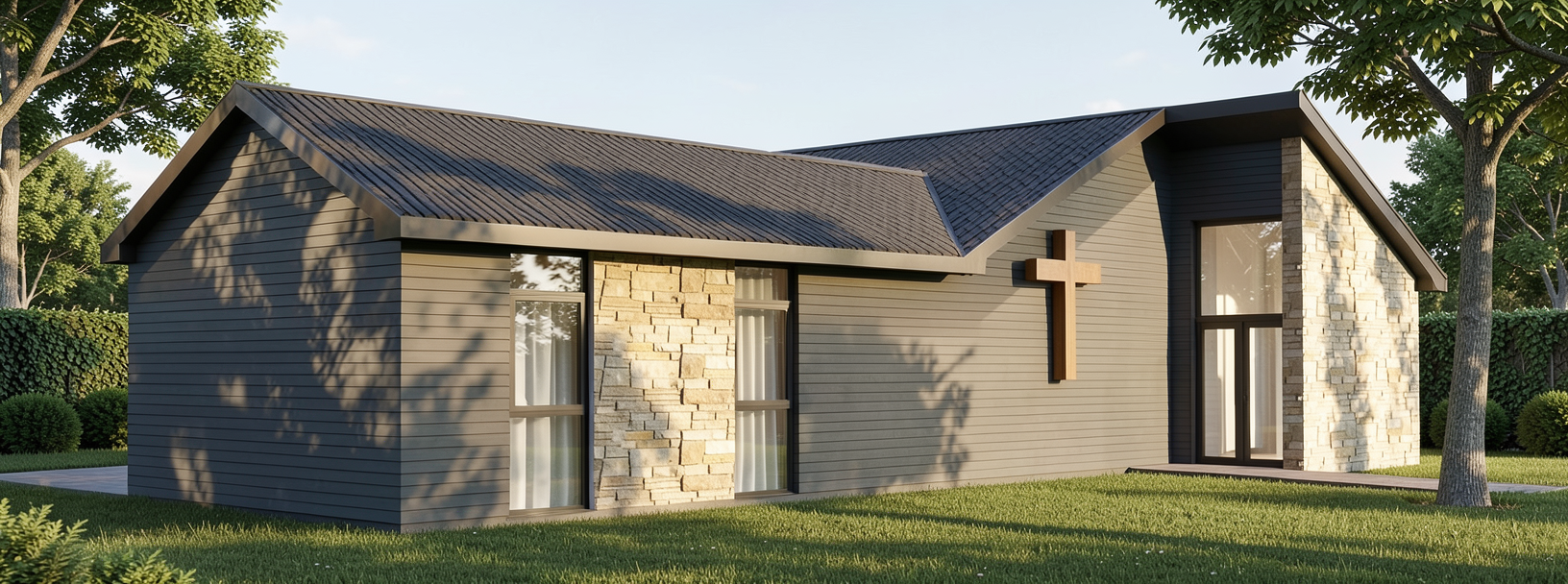 inside a metal building mechanic shop with white plastic covered insulation on the ceiling primer red steel metal building columns and beams along exterior walls vertical white metal on all walls brushed concrete flooring red and white dump trucks two mechanics in red tshirts and blue workpants working black stairs and railing industrial lighting glass and red garage doors with a gravel drive and limited landscaping beyond black windows with the office beyond