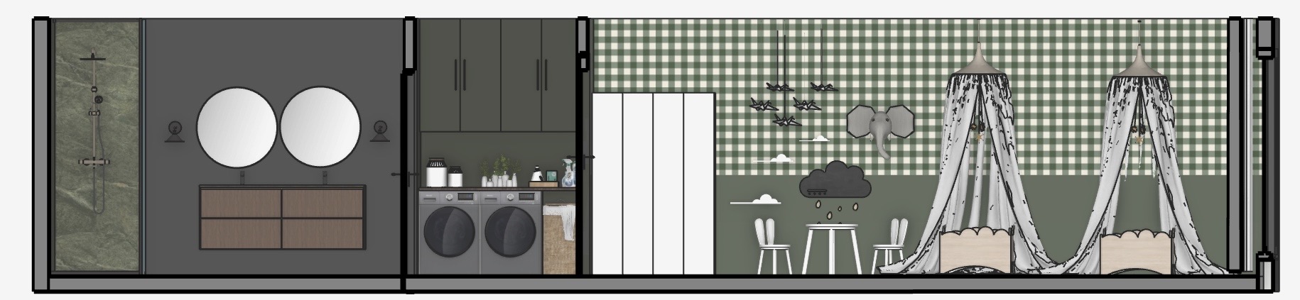 convert this floor plan into a realistic isometric 3d view of a full house show the space from an elevated angle with furniture walls and details visible create a cozy and stylish interior design featuring a modern shower with a dark green marble backdrop next to it a sleek gray bathroom wall with two round mirrors and a dark wooden vanity adjacent is a laundry area with deep green cabinets and a wooden countertop neatly arranged with laundry essentials include a children s play area with a playful green and white checkered wall featuring whimsical cloud and animal illustrations a white wardrobe two elegant canopy beds with delicate white drapes flank the scene the color palette should consist of dark greens soft grays earthy browns and crisp whites evoking a warm and inviting atmosphere the entire floor is dark wood use the same furniture as shows on the plan do not change the orientation of the floorplan