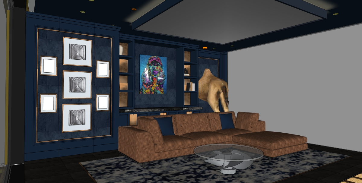 dusk sarasota fl soft accent lighting in shelves camel leather sofa black and white photos in frames accolades on shelving mirror on underside of drop ceiling structure maintain deep blue color on walls and cabinets with gold accents moody library vibe recessed lights in ceiling to provide ample light in space entire right side wall is large seamless glass window maintain shelving structure as is maintain texture and materials on walls maintain large artwork as shown add luxurious throw pillows on sofa