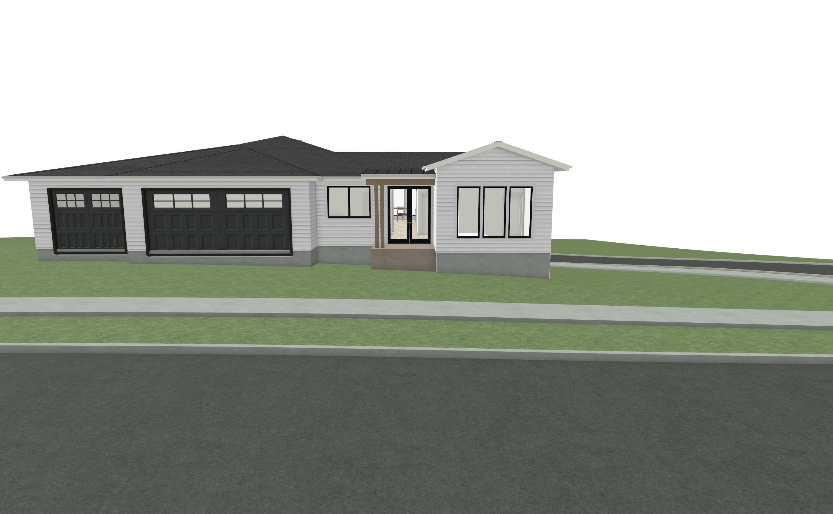 wood siding main siding is charchoal black and as an accent natural weathered wood with visible grain variation subtle color shifts slight roughness and realistic aging high end mountain modern jackson hole style stone veneer sharp high detail stone texture with depth shadow between joints natural color variation cool grays tans realistic mortar definitionmetal roof trim matte dark asphalt shingle and dark fasciawindows doors keep exact mullions and layout enhance glass realism with slight reflectivity and interior glow this is in the montana with views of the bitteroot no trees close by the hill slopes down in the back this is in a suburb so add houses around it there is no house directly behind the house do not show houses behind this house or to the right do not switch up the gable material from whats below so if black siding on wall make black in gable if would on main then would in gable