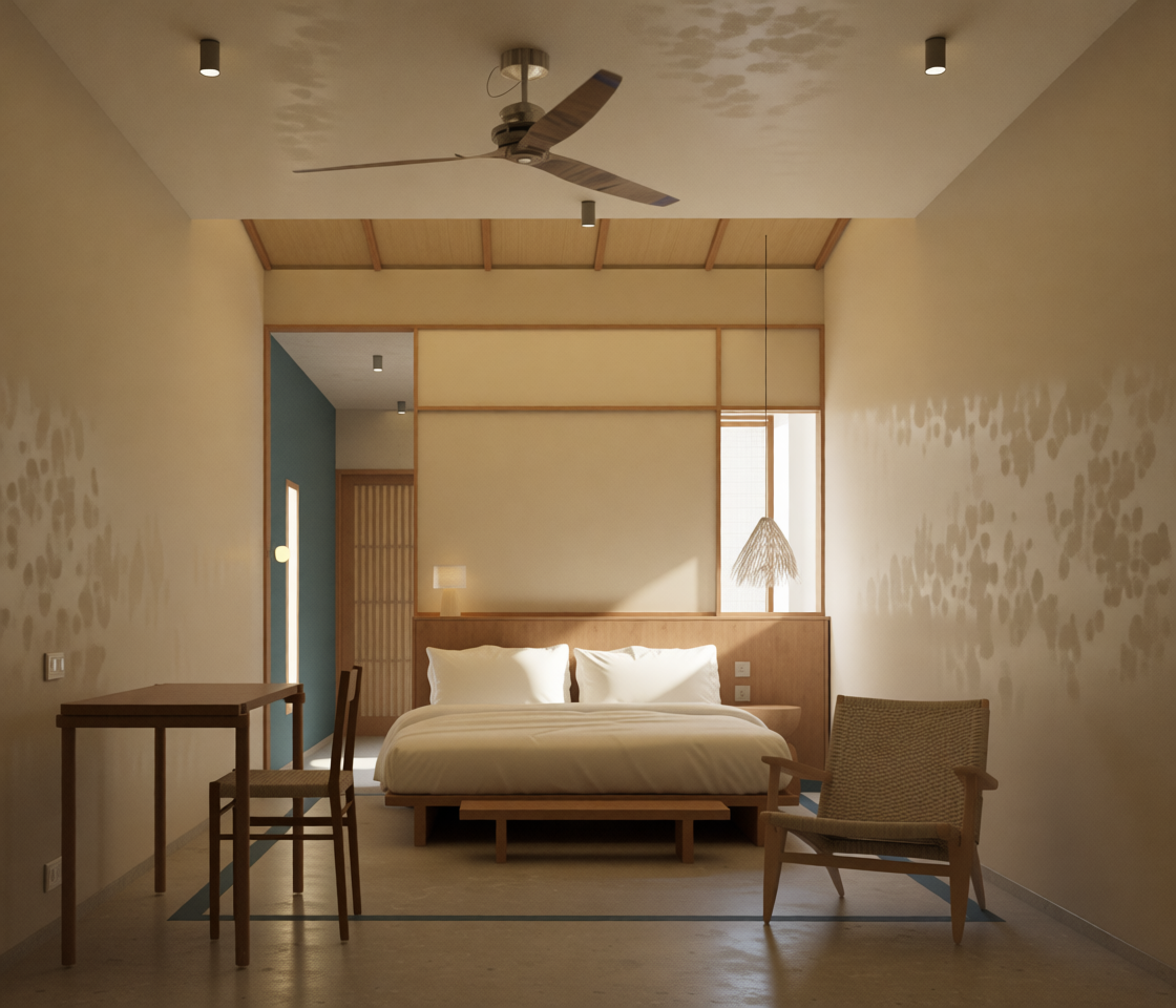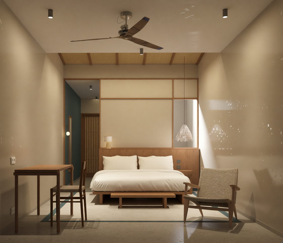 maintain the existing design exactly as it is no changes to geometry layout materials furniture or colors introduce daylight coming from the front of the room aligned with the observer s viewpoint the light should be diffused soft and realistic filling the room with gentle brightness and creating subtle shadows do not add windows or modify the wall structure in any way enhance realism through accurate light behavior global illumination and soft shadow transitions from the front artificial lighting can remain off or very subtle keep the existing atmosphere calm and natural no other changes to the scene preserve original design intent completely do not modify the room s structure