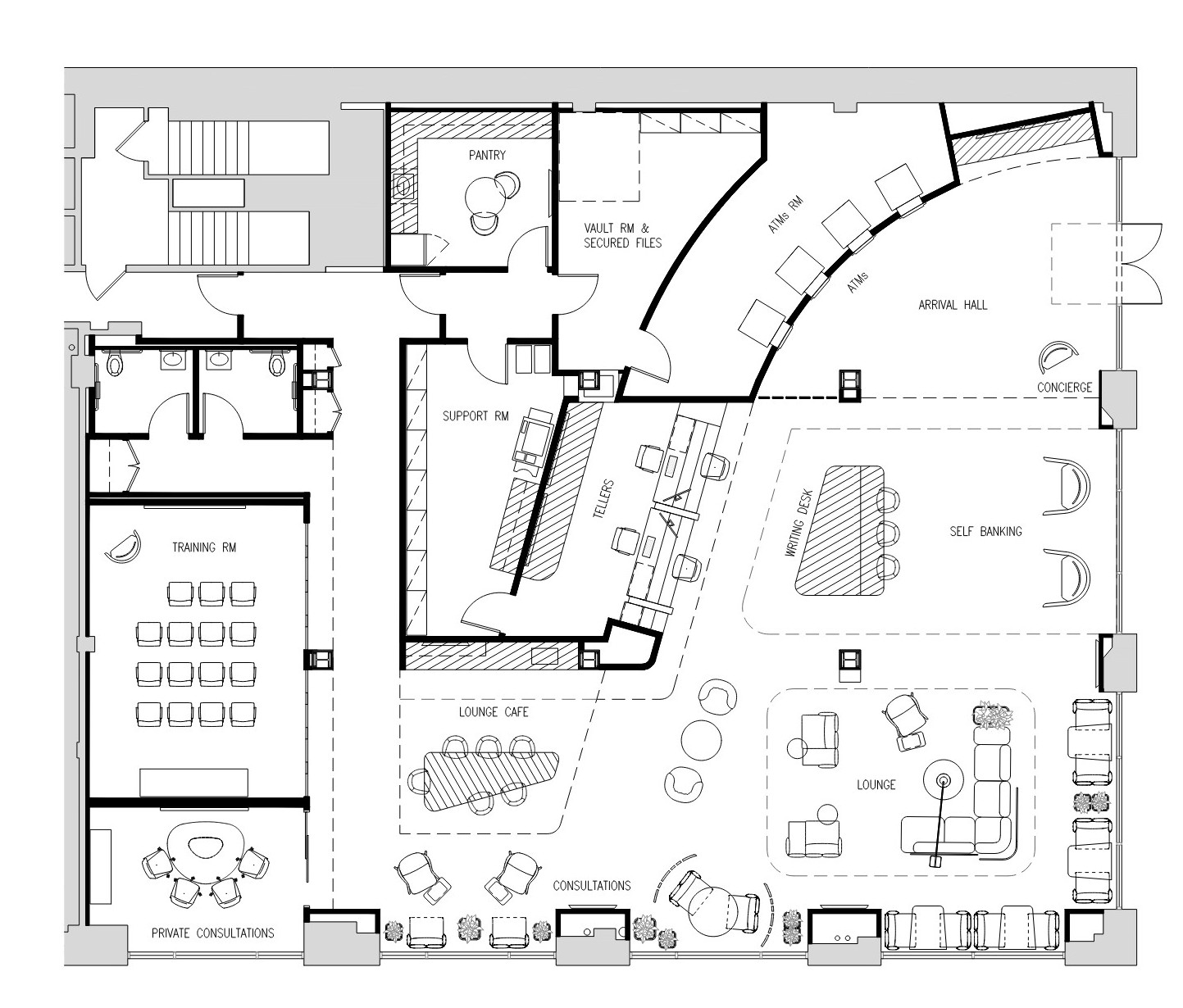 create axonometric rendering of the architectural floor plan with a 60 degree angle bird s eye view perspective create soft shadows wood flooring in general areas light grey carpet in meeting rooms and small aggregate terrazzo finishing in pantry and lounge cafe render in a realistic modern architectural visualization style