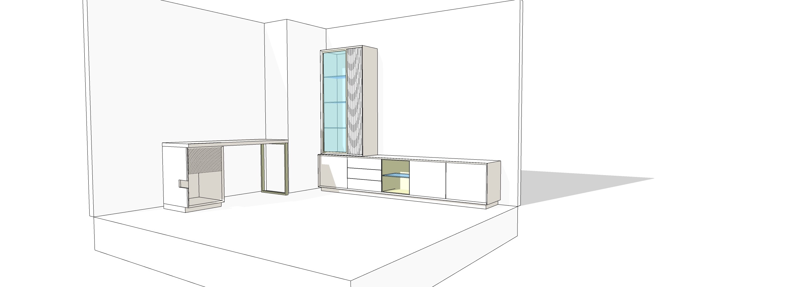 crea una imagen foto realista de esta escena no modifiques el mobiliario ni las proporciones el acabado de este mobiliario es color topo clarito excepto las piezas que tienes en tono mas amarillo que son en acabado met lico champagne a ade una planta alta a la derecha del mueble una tv e n la zona libre del bajo de tv en la vitrina a ade unas copas en el interior ademas de l neas de led dentro del mueble en vertical luz c lida a continuaci n en la pared siguiente hacia la izquierda a ade un cuadro moderno y en la pared del escritorio a ade una ventana por la que entra luz natural con un estor de tejido blanco y a ade una silla en polipiel blanco en el escritorio ademas de un port til y algo de decoraci n el suelo es madera clara y las paredes en blanco