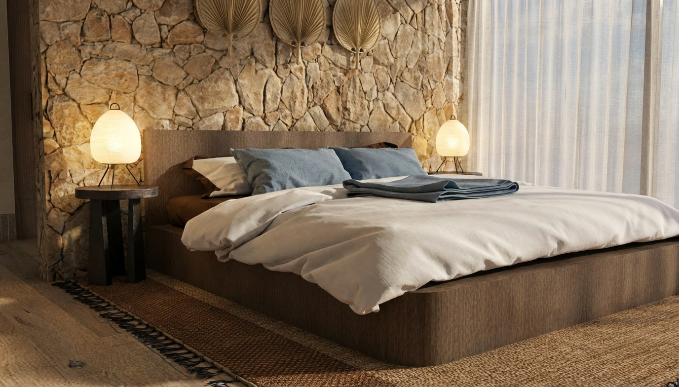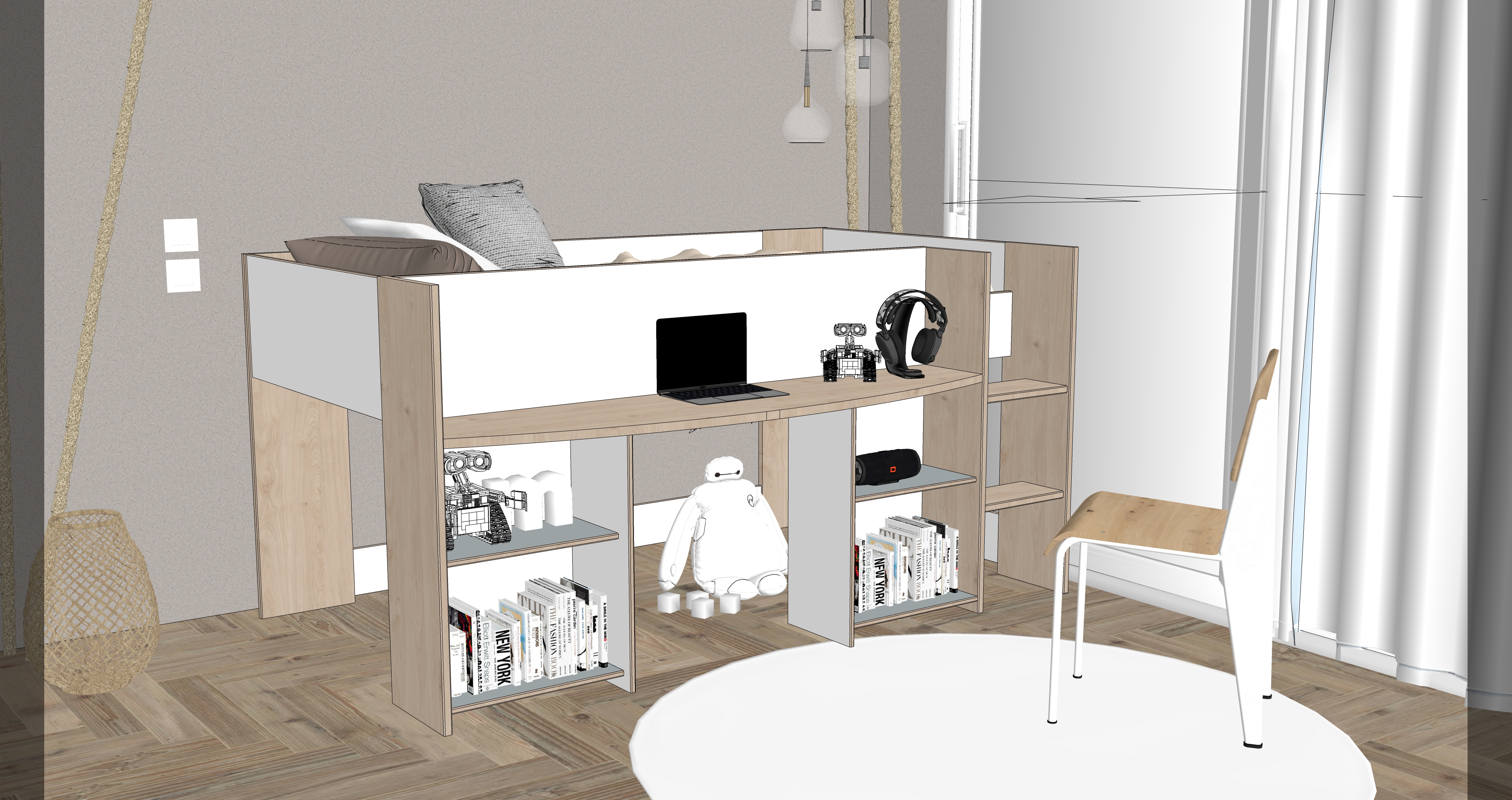 chambre d enfant chaleureuse et moderne ambiance douce et naturelle espace principal compos d une alc ve en bois clair int gr e dans un meuble mural blanc avec des tag res remplies de livres jouets en bois et paniers en fibres naturelles guirlande lumineuse d licate accroch e sous les tag res clairage doux et cosy au sol tapis rond tress beige mur avec texture de terre cuite lampe rafia en haut de l image pour clairer la pi ce dans la pi ce une fen tre apportant une lumi re naturelle douce petit train en bois pos sur le tapis palette de couleurs naturelles beige blanc bois clair teintes douces et apaisantes style scandinave chaleureux et minimaliste