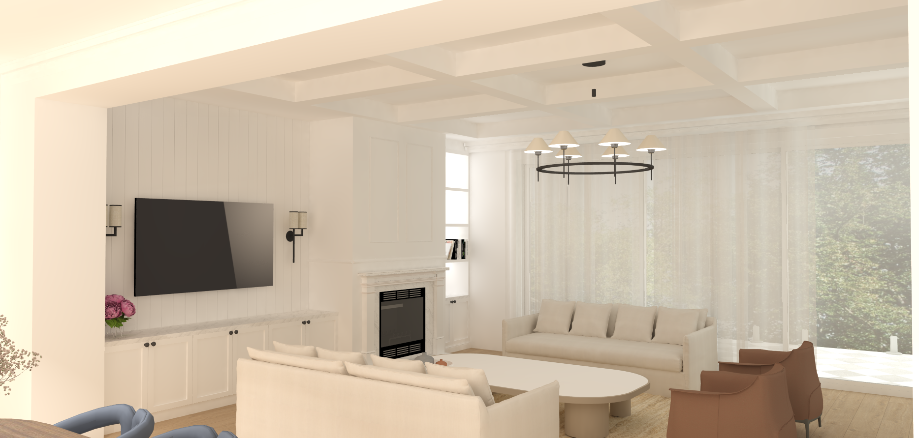create realistic image add cornice detail to the room all cabinetry in white bench top in carrara marble turn wall lights and pendant light on