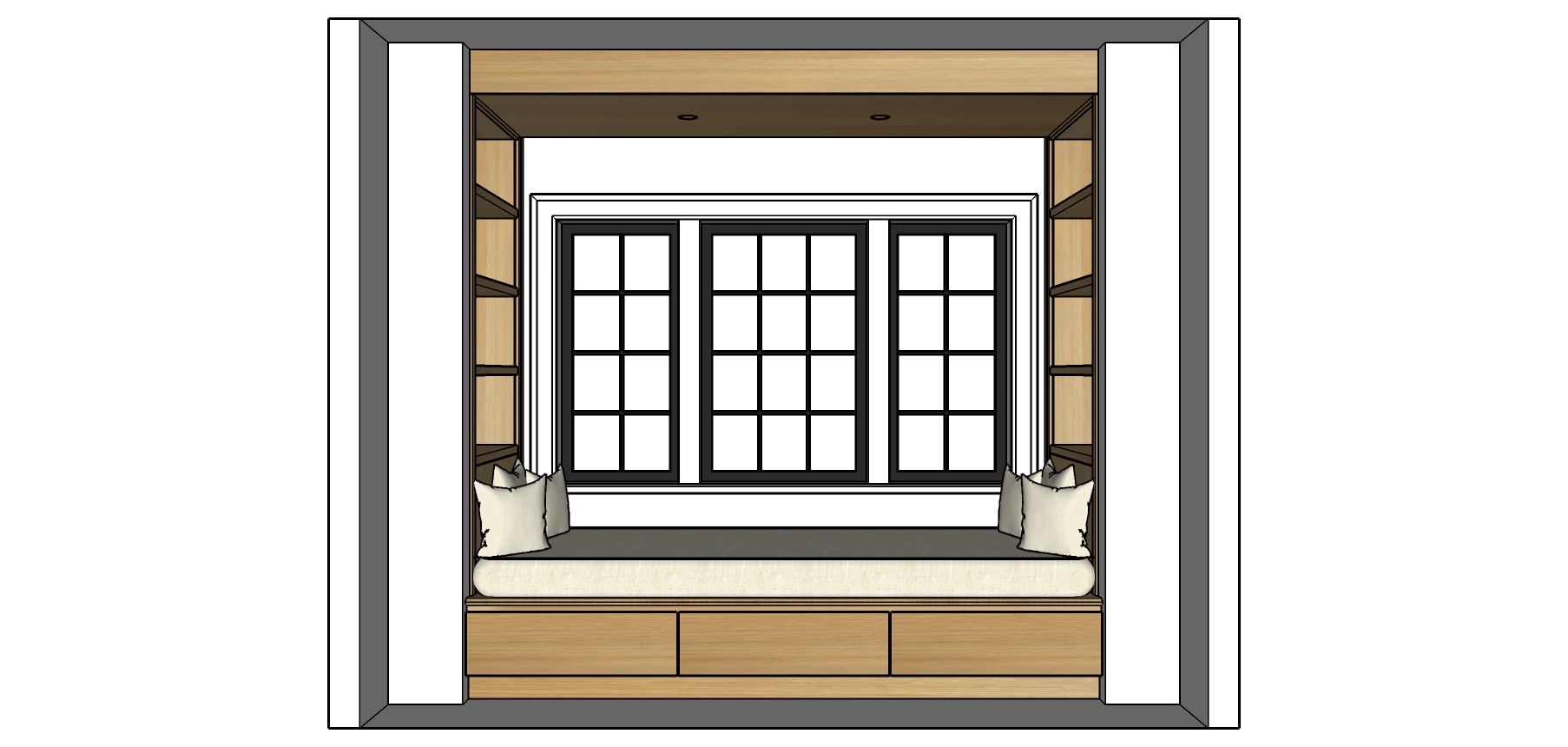 layer 1 geometry authority the uploaded drawing is an architectural elevation and is the authoritative geometry reference for the scene treat the reference drawing as a completed cad model with fixed geometry the architecture is finalized and immutable the renderer may only apply materials lighting and photorealistic rendering while preserving the exact architecture layer 2 project overview custom built in window seat millwork centered within a recessed wall niche symmetrical composition with integrated side shelving lower storage drawers and an overhead oak drop ceiling feature layer 3 architectural layout recessed wall niche with equal left and right returns three evenly spaced window units aligned horizontally at the back wall continuous window seat spanning full niche width built in shelving units on both left and right sides vertically stacked and symmetrical overhead drop ceiling panel in wood inset within the niche 4 inch horizontal gap between back wall and rear edge of drop ceiling panel for concealed lighting layer 4 cabinetry and millwork bench base consists of three equal width slab drawer fronts aligned horizontally drawer fronts are flat slab panels with clean uninterrupted faces no visible hardware handleless appearance cabinetry is fully integrated and flush with surrounding millwork side shelving units multiple evenly spaced horizontal shelves on both sides open shelving no doors symmetrical left right configuration millwork is clean lined and modern with tight consistent reveals no decorative trim no paneling no profile edges layer 5 doors and built ins no doors present built in bench and shelving are the only millwork elements layer 6 materials and finishes all wood elements bench base shelves drop ceiling panel rift sawn white oak subtle linear grain matte to low sheen finish natural tonal variation wall surfaces and all window trim painted white smooth finish soft matte reflectivity windows frames and muntins are matte black clean grid pattern preserved exactly as drawn bench cushion light neutral fabric soft cream or off white subtle texture woven linen appearance throw pillows light neutral tones soft fabric with minimal texture variation layer 7 lighting design two recessed downlights integrated into the oak drop ceiling panel positions match drawing exactly concealed linear led strip located in the 4 inch gap between the back wall and the drop ceiling runs the full width of the niche produces a soft wall wash glow downward across the window and wall surface lighting temperature warm soft white 2700k 3000k no exterior daylight assumption lighting reads as controlled architectural illumination layer 8 mirrors and reflections no mirrors present window glazing reflects soft diffuse interior light only no exterior scene visible keep reflections minimal and neutral layer 9 styling shelves and accessories add minimal realistic styling to shelves stacks of books neutral covers varied sizes a few upright books with subtle color variation small framed photographs thin frames neutral tones styling must remain sparse and balanced do not overcrowd shelves maintain symmetry and architectural clarity layer 10 flooring floor not prominently visible if shown neutral toned wood or soft matte surface must not distract from millwork layer 11 camera and composition eye level camera centered on the niche straight on elevation perspective 35 50mm lens perfect symmetry emphasized tight framing capturing full niche width and height architectural photography composition layer 12 rendering realism controls extreme photorealism physically accurate materials ray traced global illumination soft indirect lighting from led strip realistic shadow gradients in niche depth subtle wood grain variation in rift sawn oak soft fabric deformation on cushion and pillows crisp edges and precise joinery no stylization no artistic interpretation strict enforcement do not alter cabinet count 3 drawers do not alter window count or proportions 3 windows do not modify shelving layout or spacing do not change ceiling geometry or lighting placement do not add or remove architectural elements the final image must read as a high end professionally photographed built in window seat installation with precise architectural fidelity