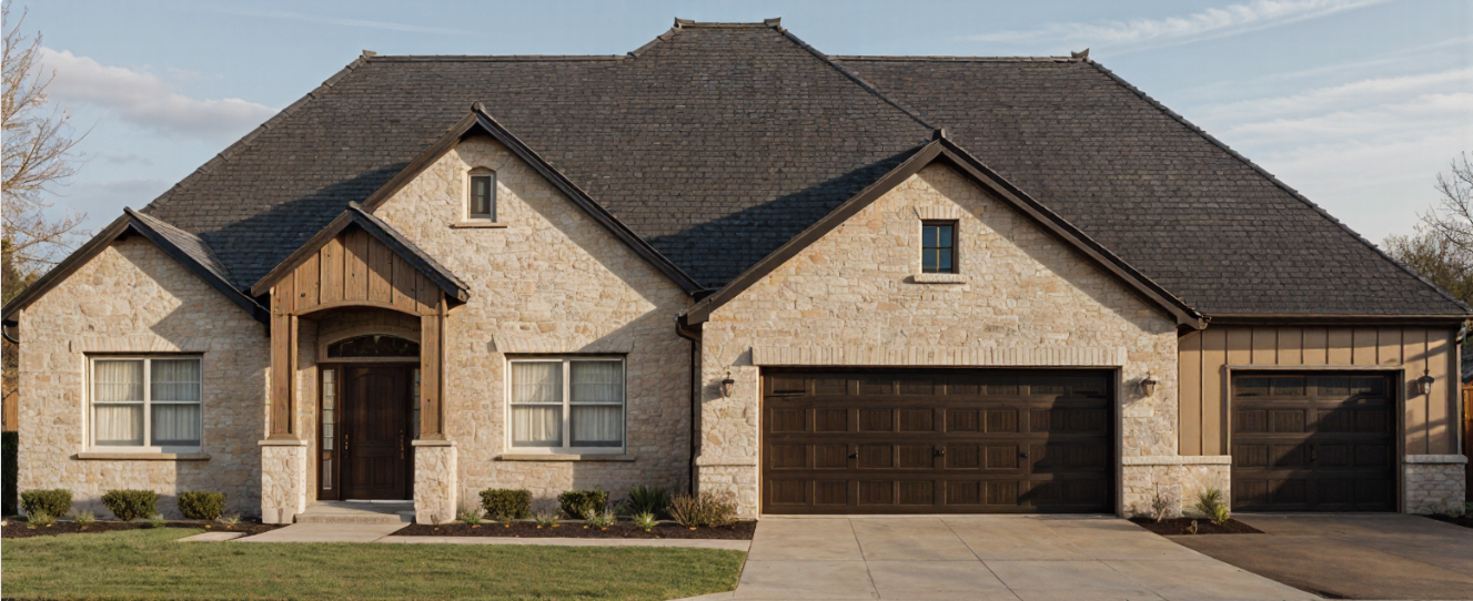 render this home realistically without changing the structure door or garage doors keep all original materials the same keep the stone to be a light cream stone in the areas that are already stone roof dark gray shingles front door walnut finish change the board and batten to be smooth painted taupe not wood or stained texture maintain the current proportions layout and geometry add realistic landscaping with neutral plants green shrubs tan and brown grasses and small trees include a natural sky with soft clouds and daylight lighting the result should look like a professional architectural photo realistic and natural not ai generated