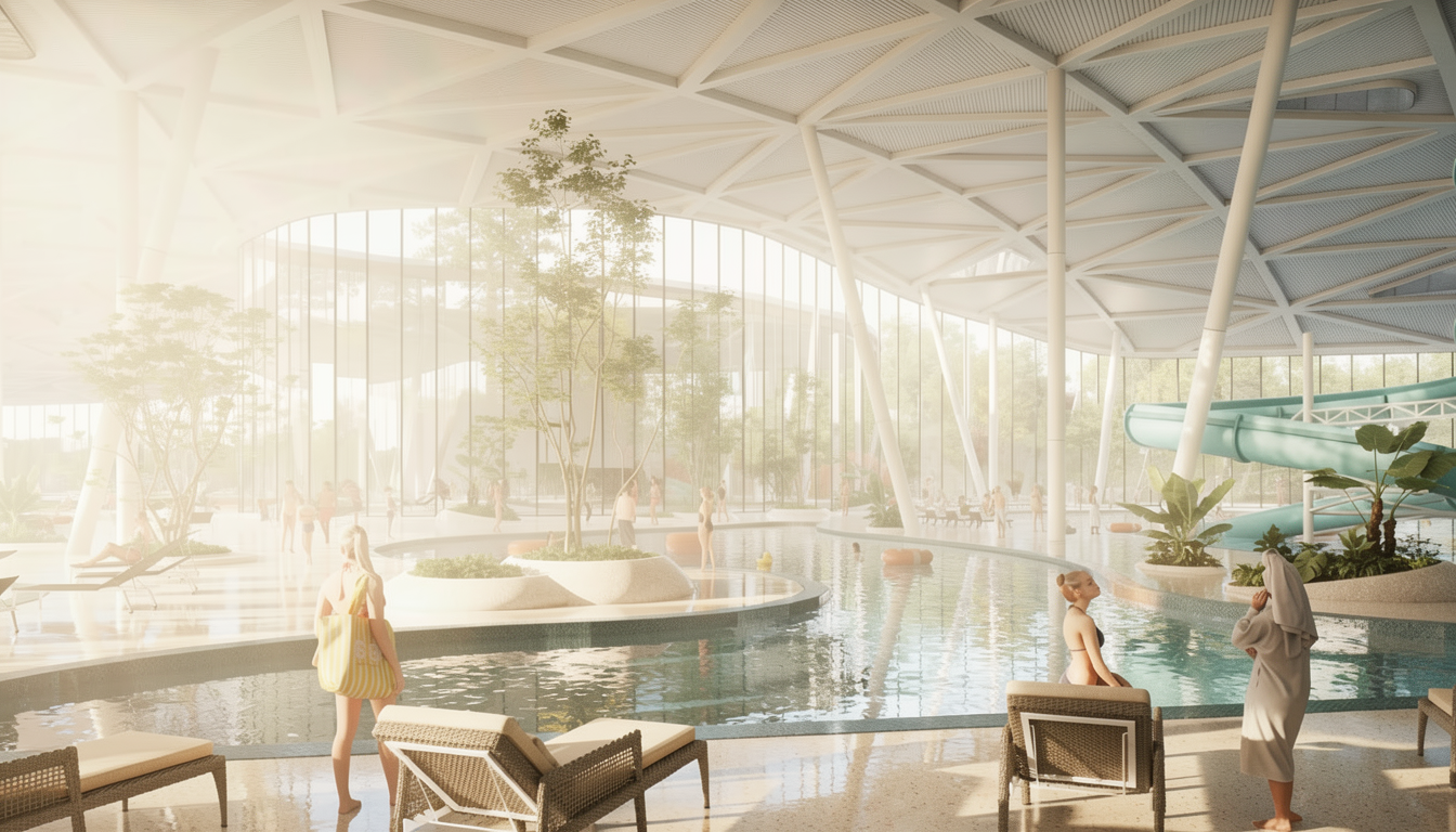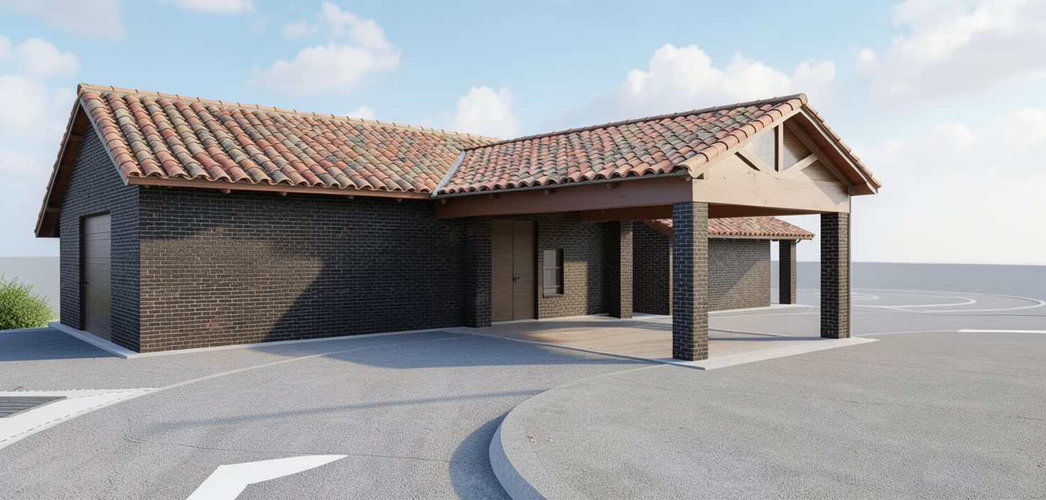 create a beautiful architectural rendering of a modern house with a black roof textured light gray stone and white walls and large glass windows the entrance is grand and inviting surround the house with lush green grass and a gravel dark gray driveway add natural wooden accents to the exterior seating and a soft serene evening atmosphere with a golden sunset light casting gentle shadows on the building enhancing its architectural features make sure to add lighting to the exterior walls of the building maybe some lights down the steps