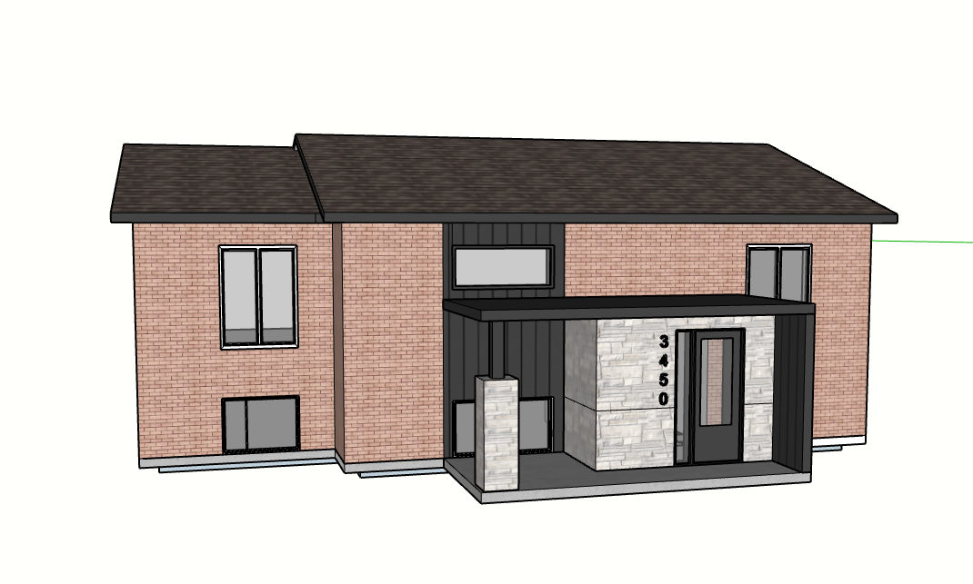 put a driveway on the left side of the house put a tree on the right side of the house put daylight in at 2 pm with no sunlight
