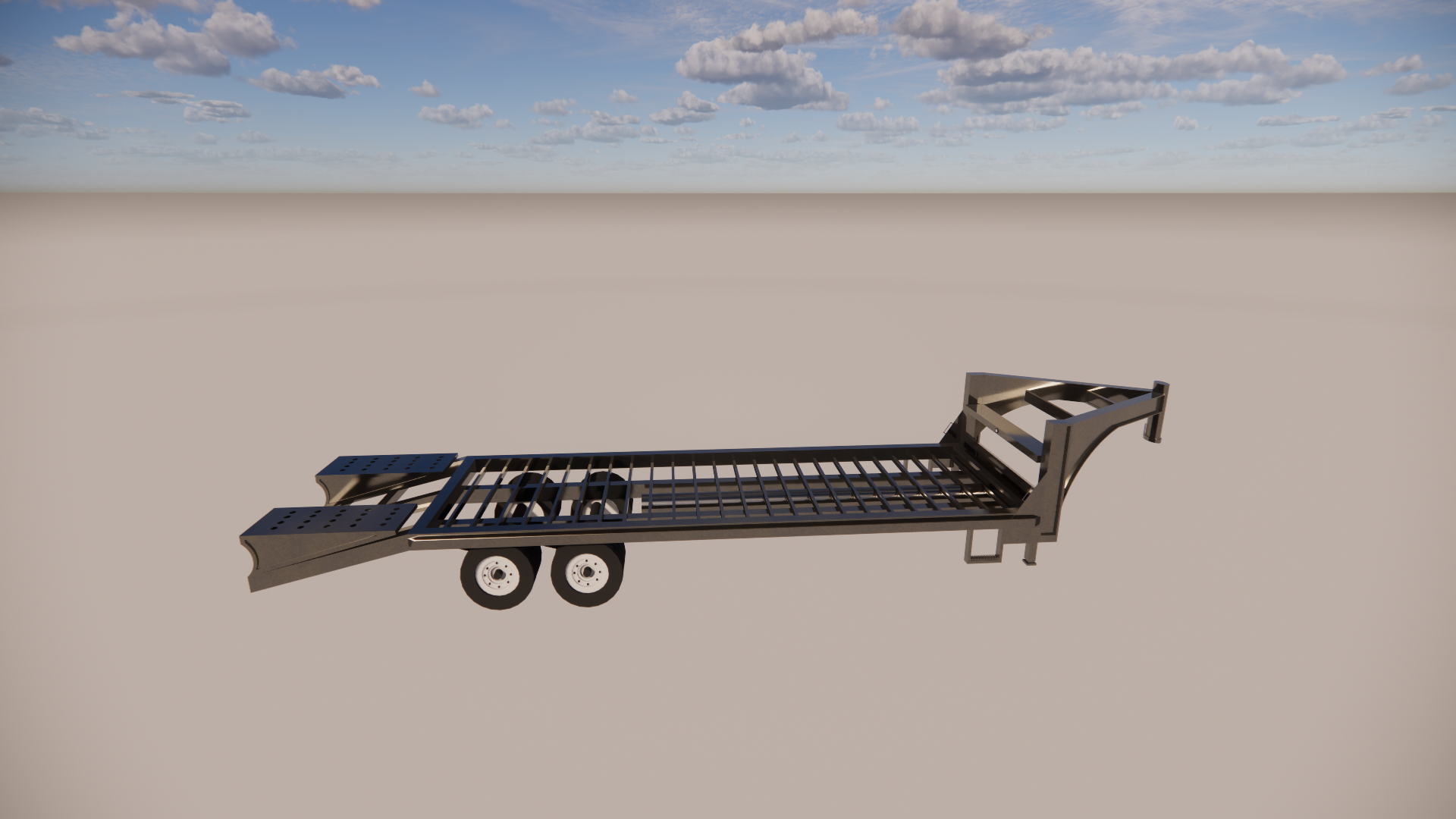 you are a rendering artist for a trailer company offering the highest quality renderings for our product place this trailer inside an empty shop make the trailer exactly like the photo do not change anything about the trailer