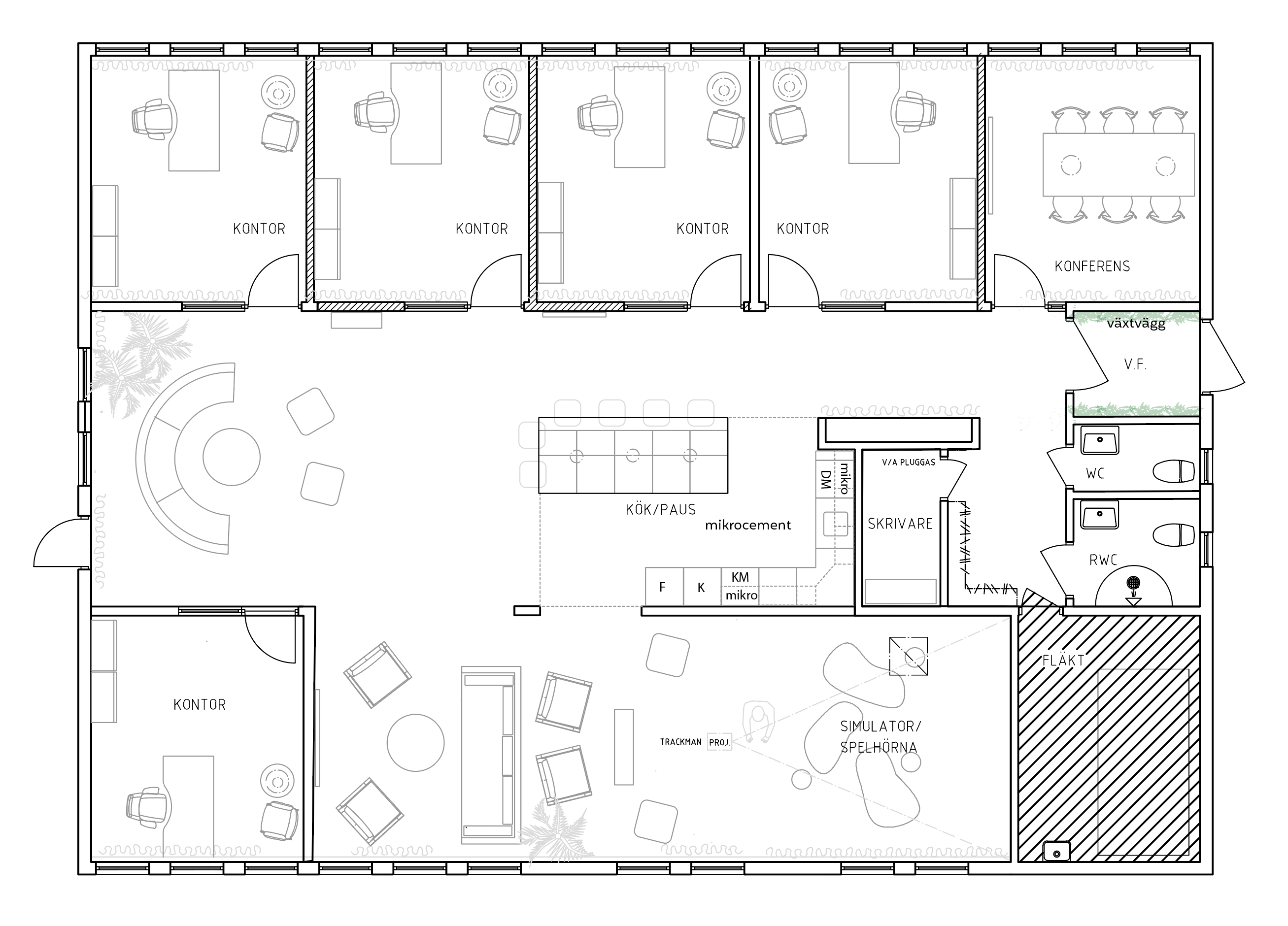convert this floor plan into a realistic isometric 3d view of a full house show the space from an elevated angle with furniture walls and details visible a modern cosy office beige textile flooring dark grey blue walls the meeting room has greyed walls leather and black funnishing a golfsimulator down to the right use the same furniture as shows on the plan do not change the orientation of the floorplan