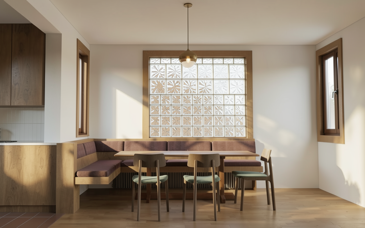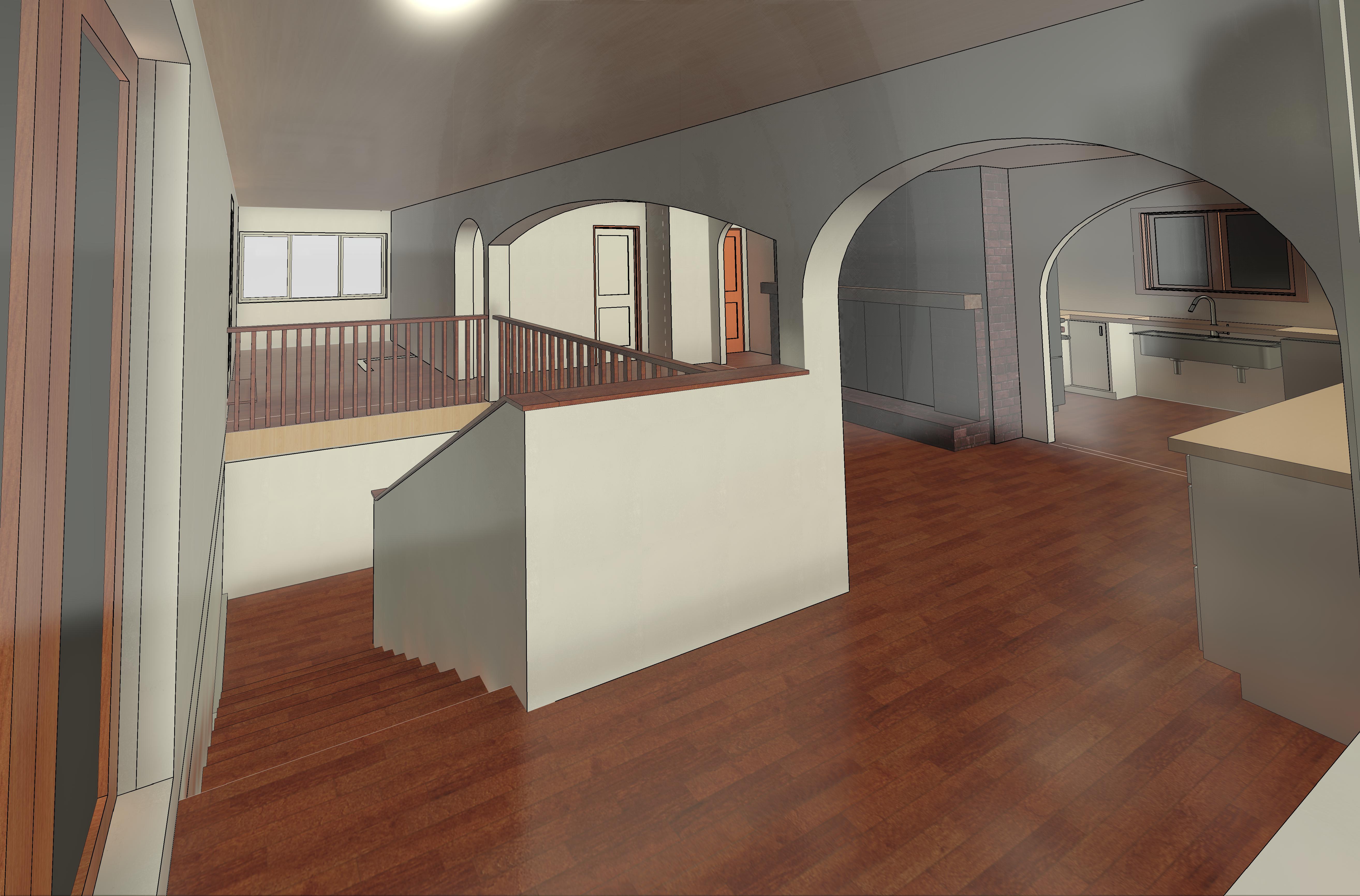interior shot render a mid century modern elegant interior space with a warm and inviting atmosphere use rich warm cherry wood for the flooring throughout the walls should be a soft neutral cream color complementing the dark wood incorporate smooth arched doorways for a touch of architectural sophistication painted in a subtle cream to blend seamlessly with the walls create a bright and airy ambiance with soft natural lighting streaming through large windows casting gentle shadows that enhance the depth and texture of the architecture add a warm glow to the lighting fixtures and ensure the overall mood is cozy and welcoming emphasizing comfort and style make the fireplace a natural aged brick color and add a dark green vertical tile in the kitchen with wood shelves to match floors make all window casings a light wood to match floors and a mid century modern pendant over the staircase