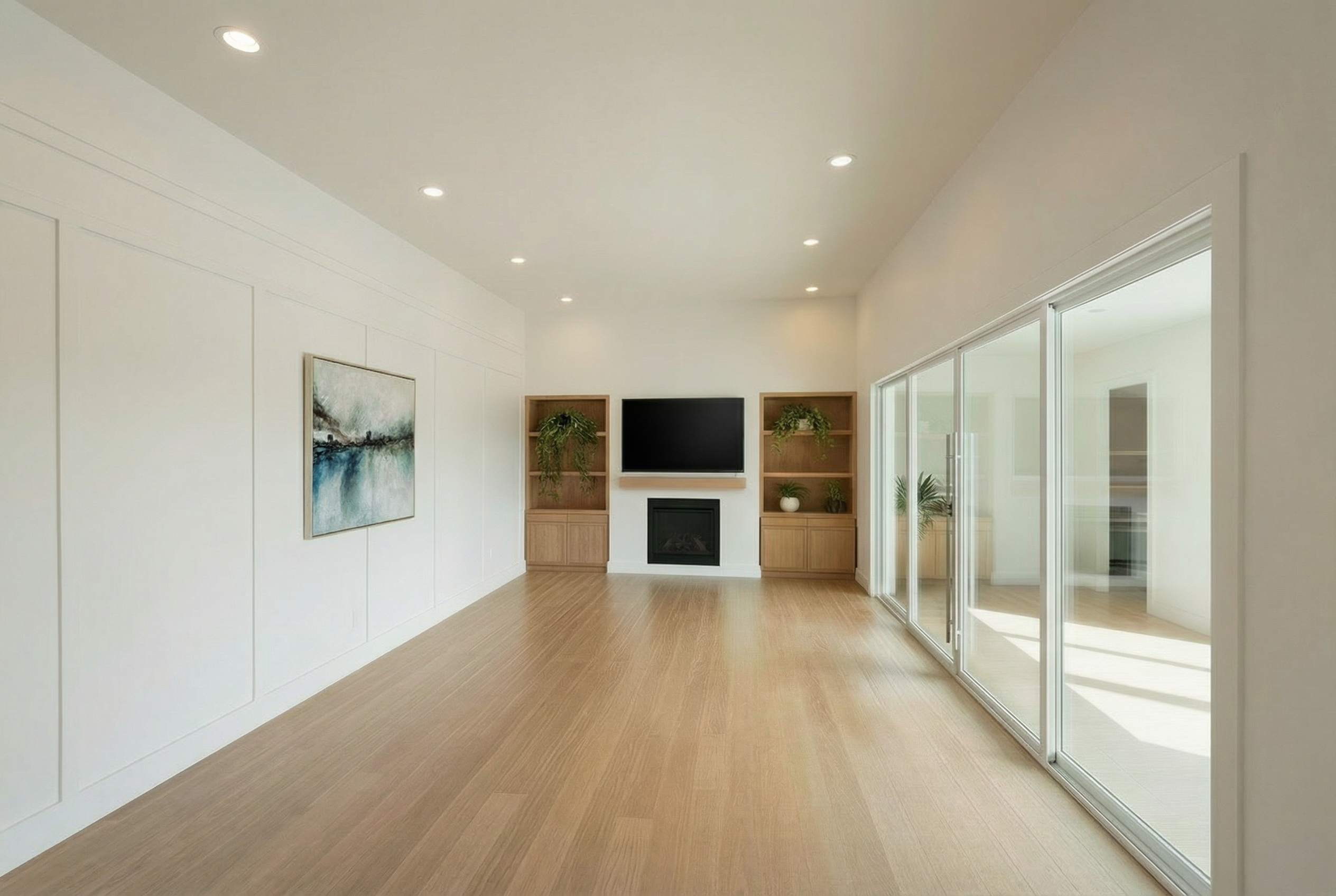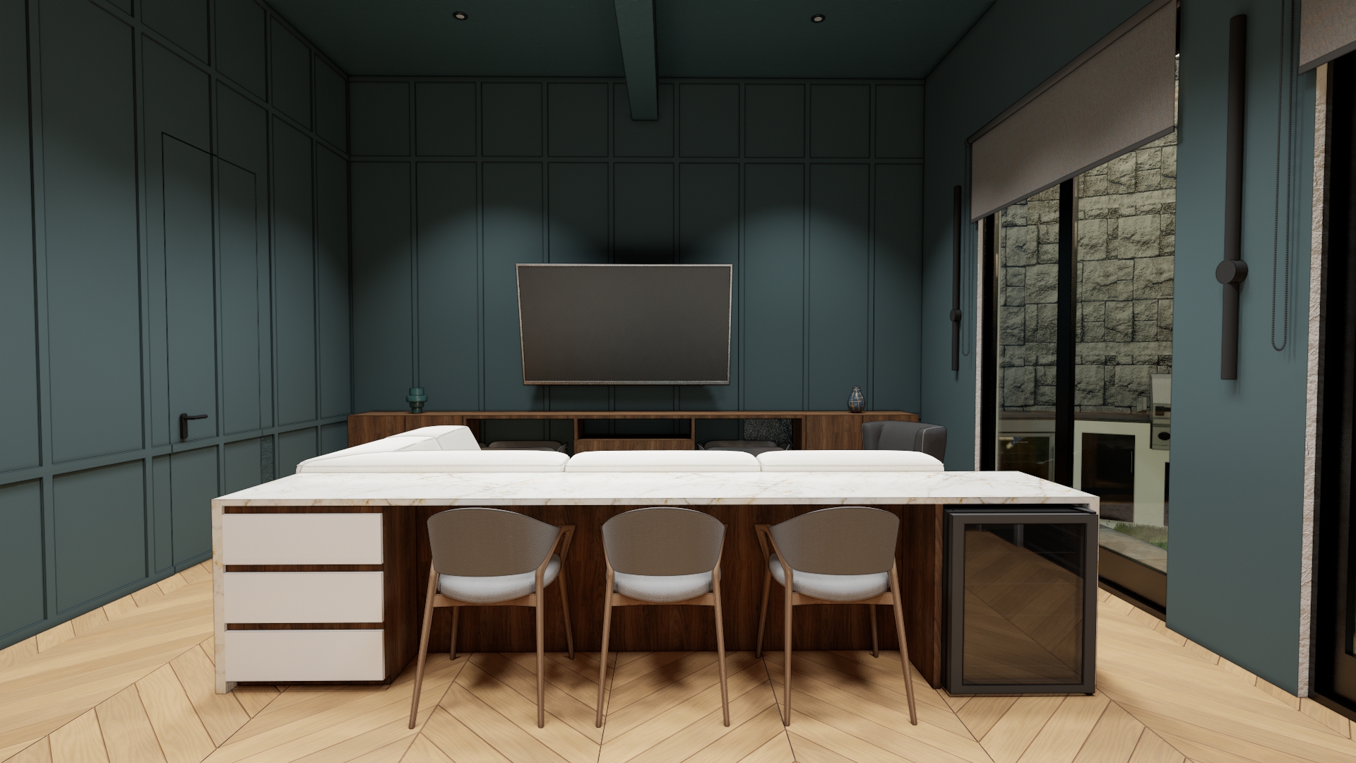 ponle reflejo a la television pero tenue que se vea reflejo de la tv mejora algunas texturas la madera del piso que sea un poco mas obscura y que el frigobar tenga dentro botellas de agua